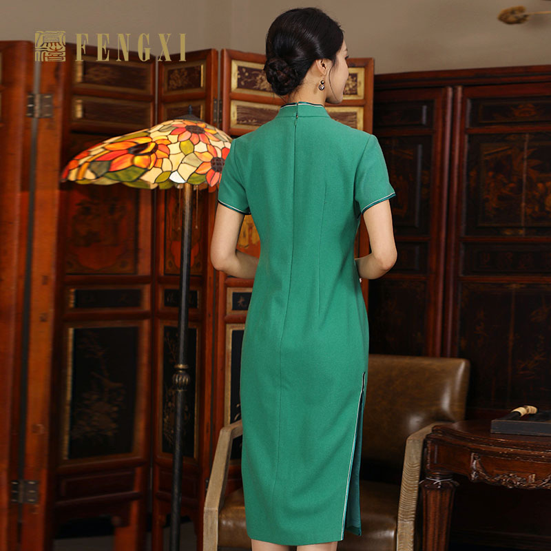 凤禧旗袍秋冬新款绿色纯羊毛呢绣花旗袍重工盘扣中式复古气质高端