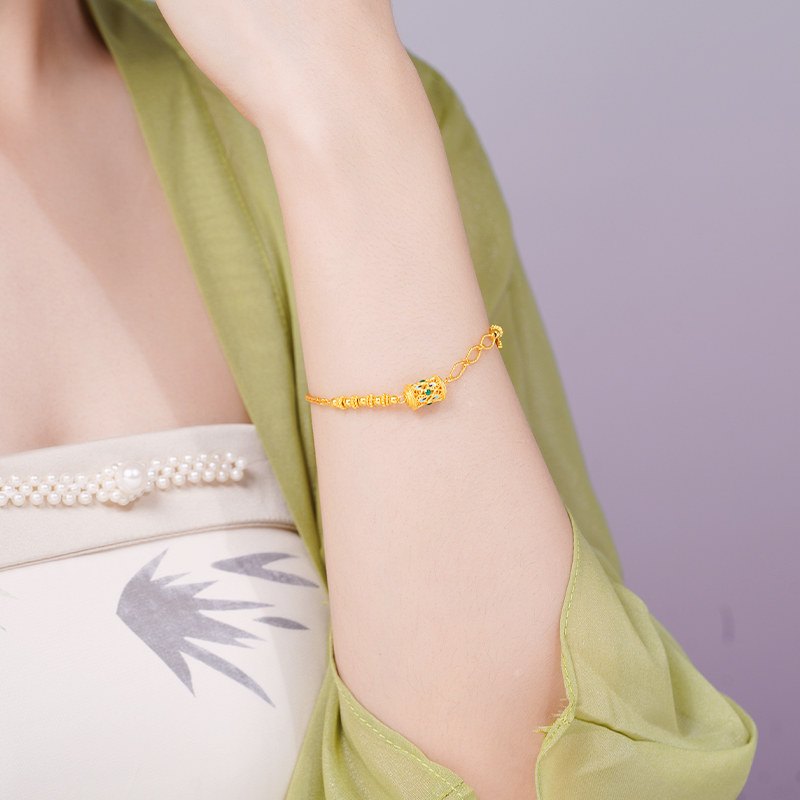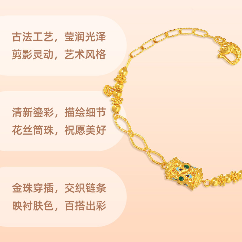 老庙黄金足金999古法鎏彩吉祥转珠手链花式链条间金珠镂空花丝