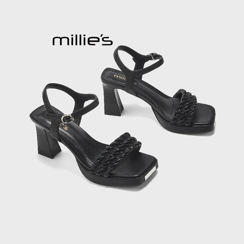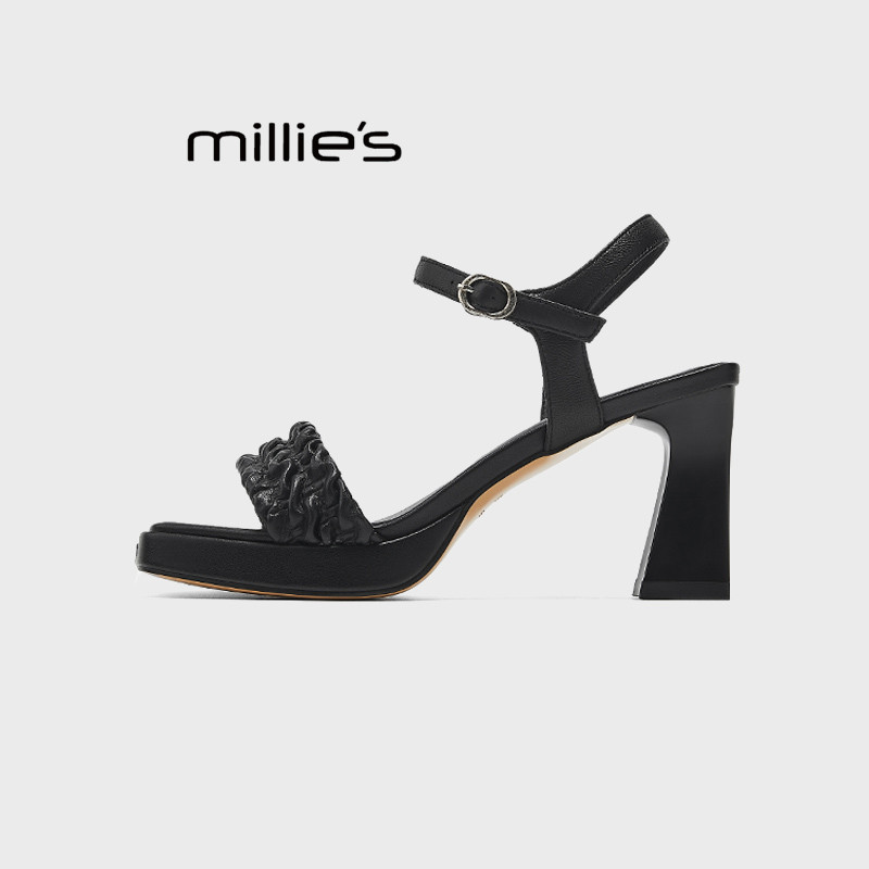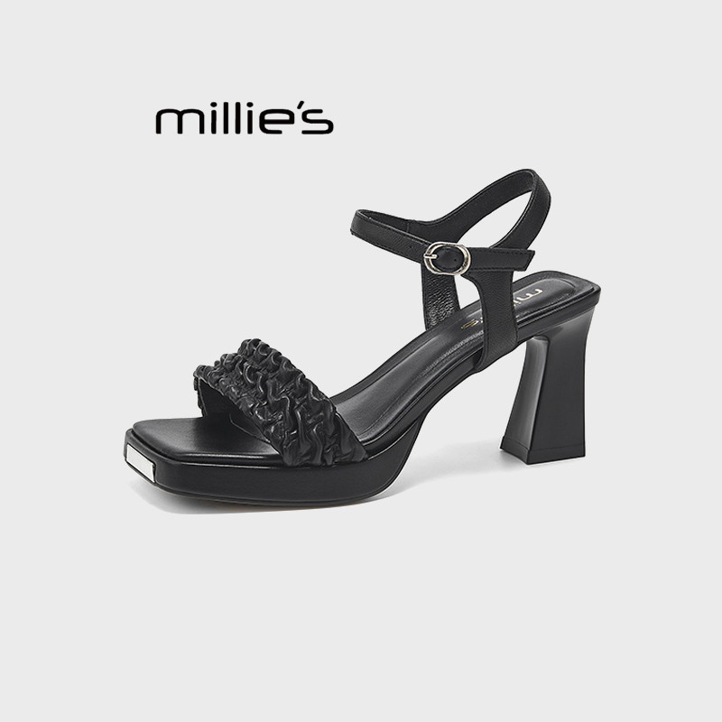 MILLIE'S/妙丽露趾粗跟凉鞋2025一字扣带女鞋简约百搭时尚夏季鞋