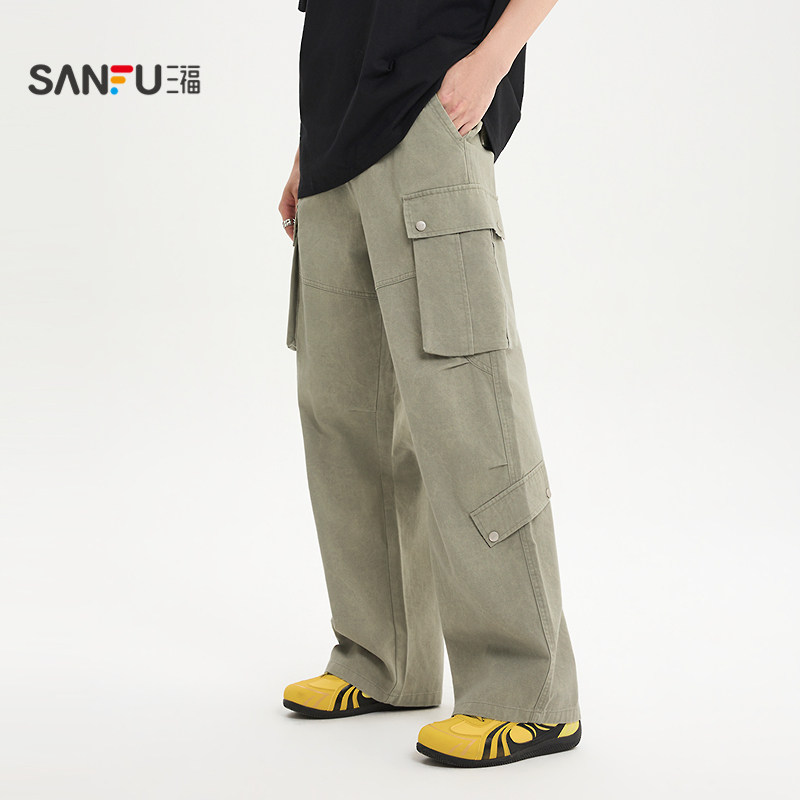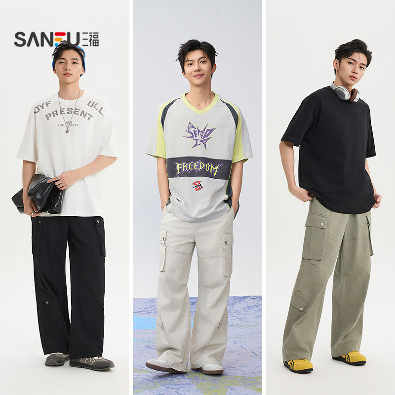 三福2026夏季男士晕染打褶工装休闲裤 潮流宽松直筒长裤520863
