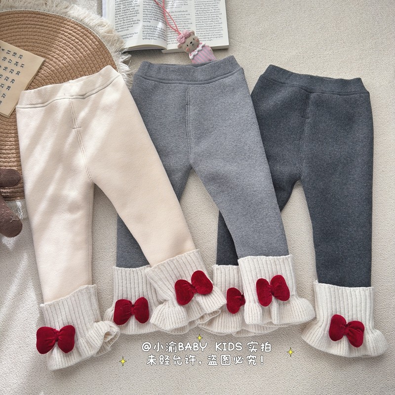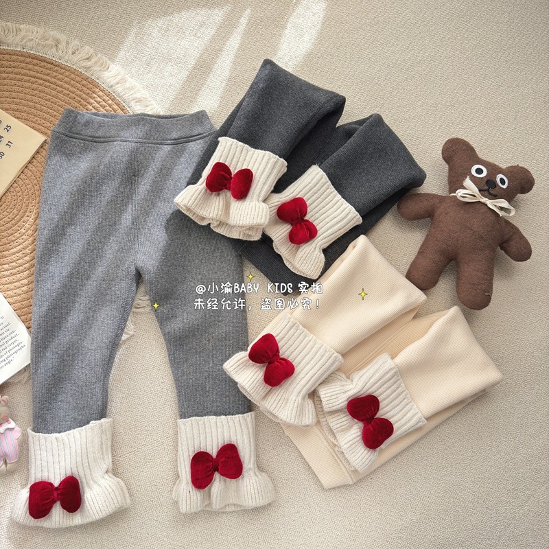女童加绒打底裤冬季新款女宝宝加厚一体绒红色蝴蝶结保暖百搭长裤