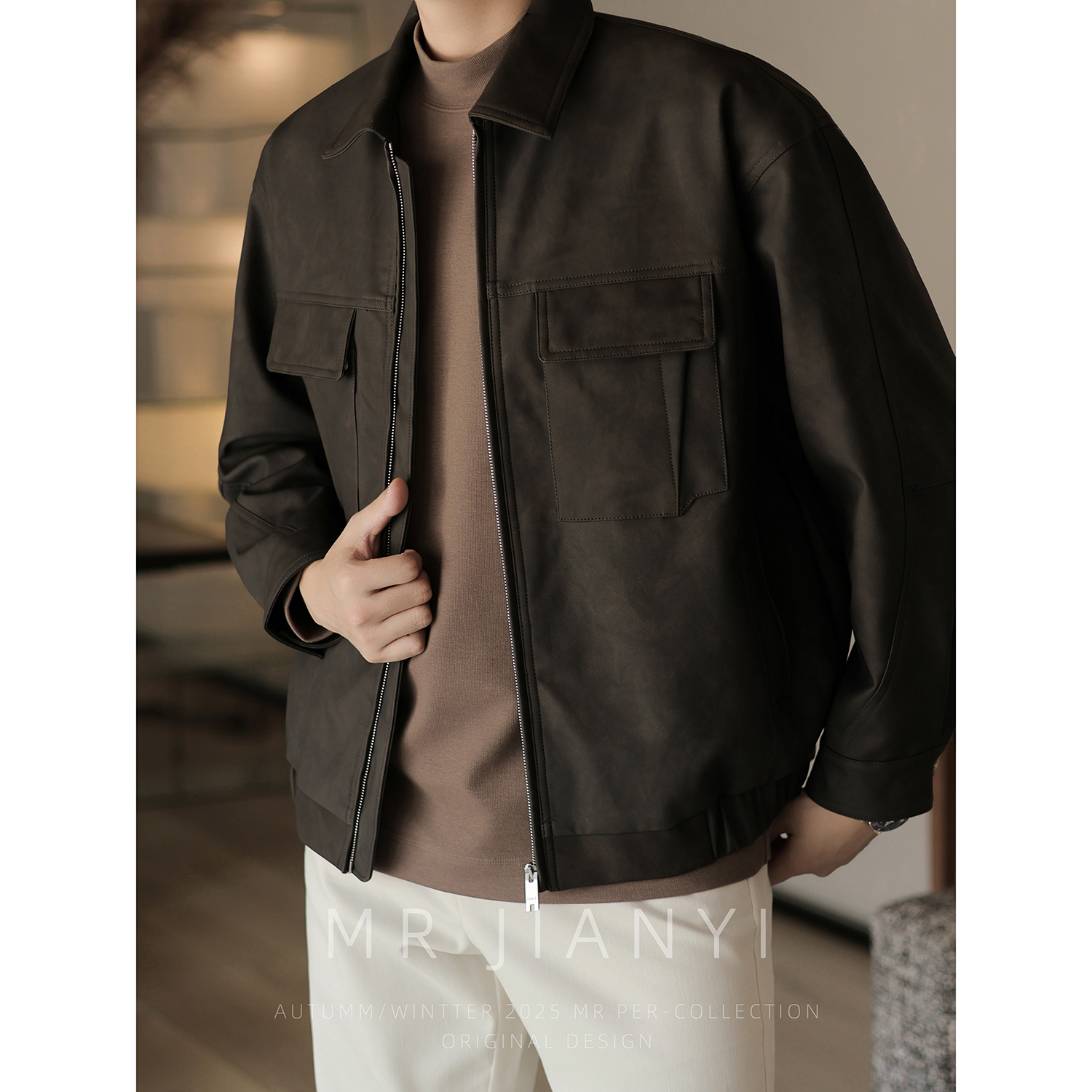 MR JIANYI 秋季「巴恩魂韵」落肩PU翻领皮夹克休闲工装皮衣外套男