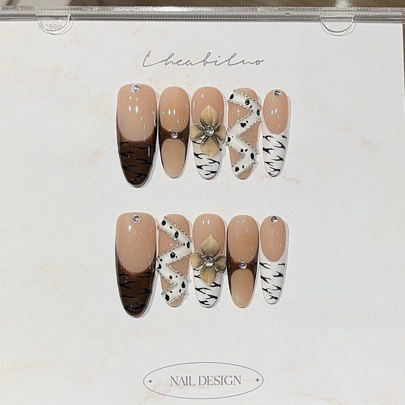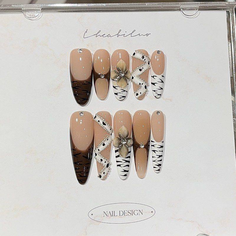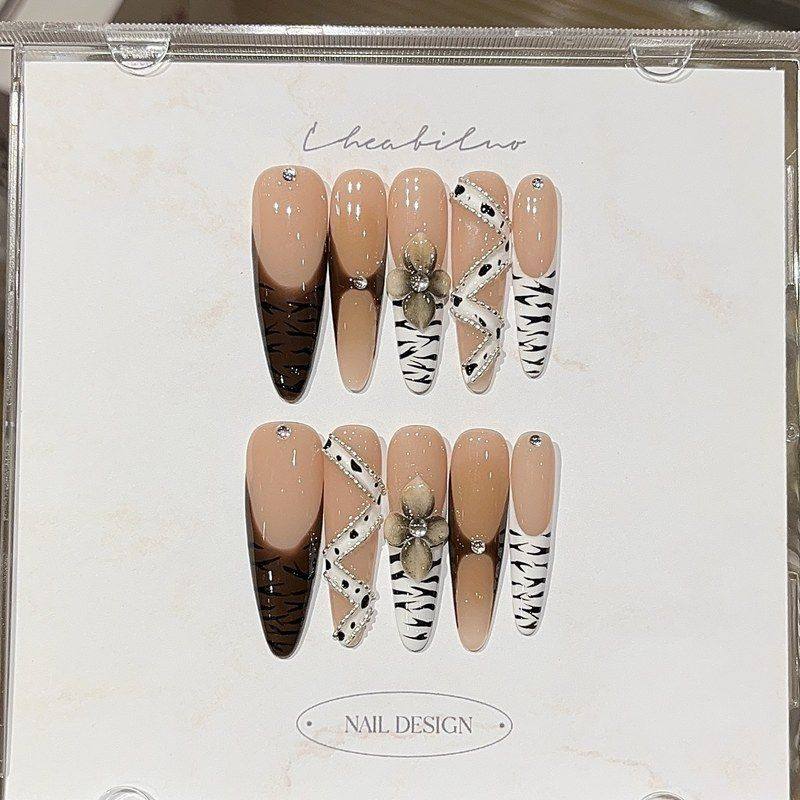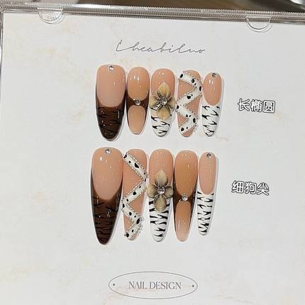 纯手工美拉德之蝶甜酷辣妹风链条绑带斑马纹法式雕花细狗尖穿戴甲