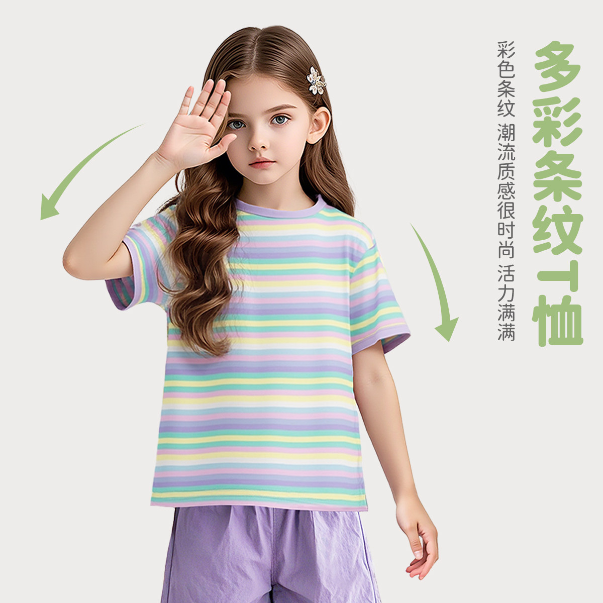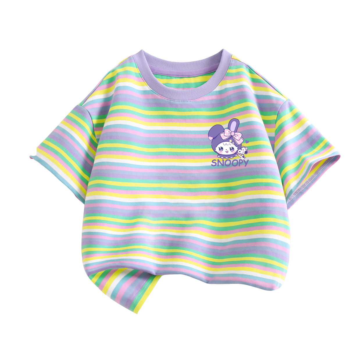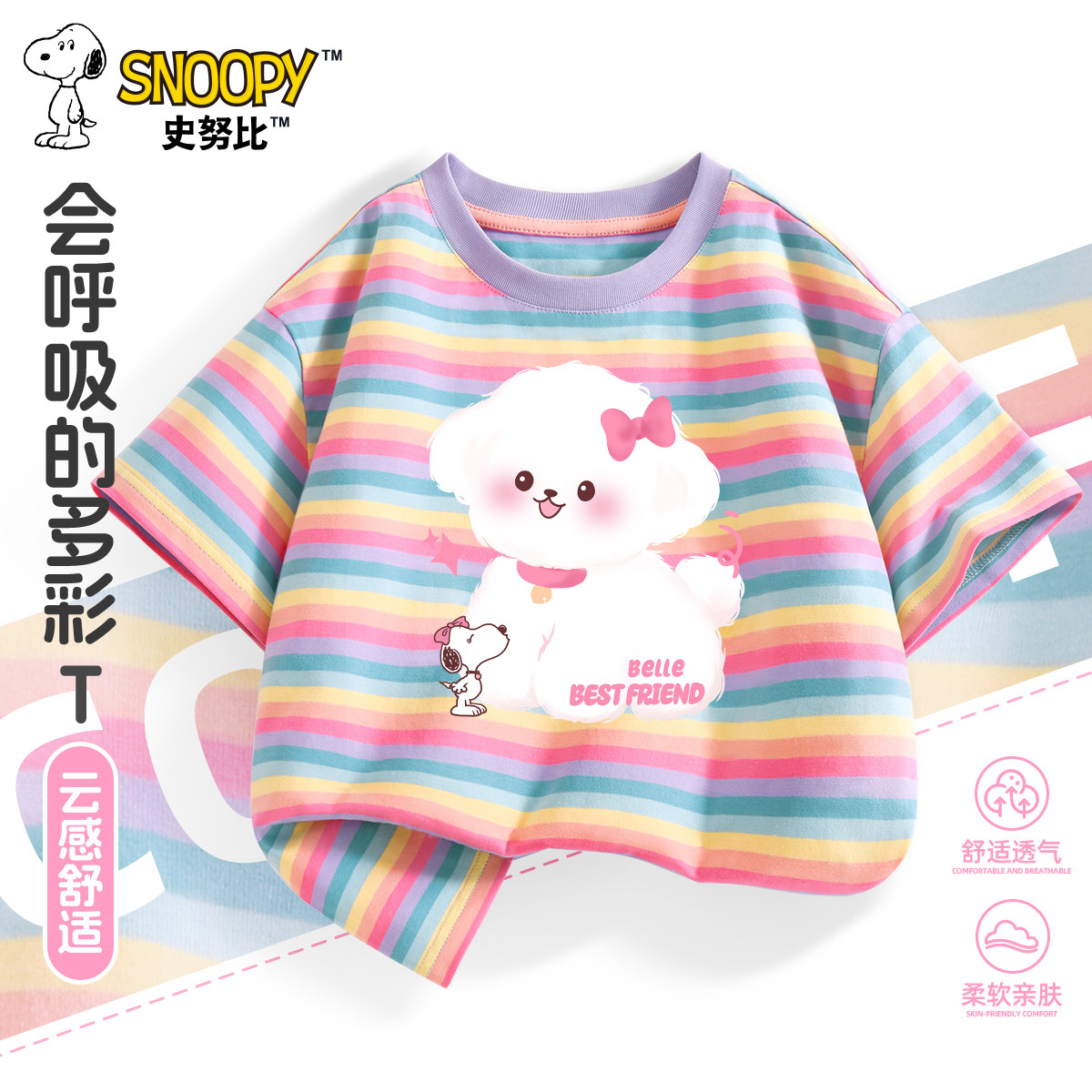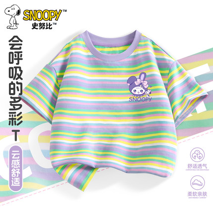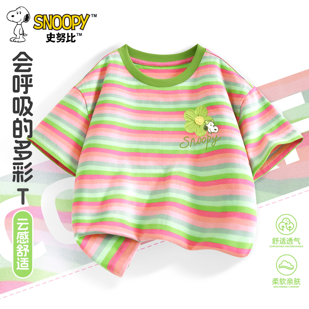 史努比女童短袖t恤夏季2025新款休闲条纹女孩半袖上衣儿童夏衣服