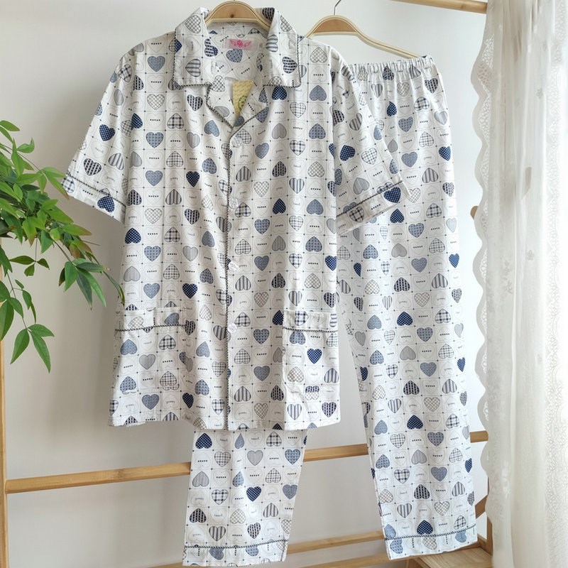 春夏男士纯棉布睡衣宽松大码短袖长裤全棉格子梭织斜纹棉布家居服