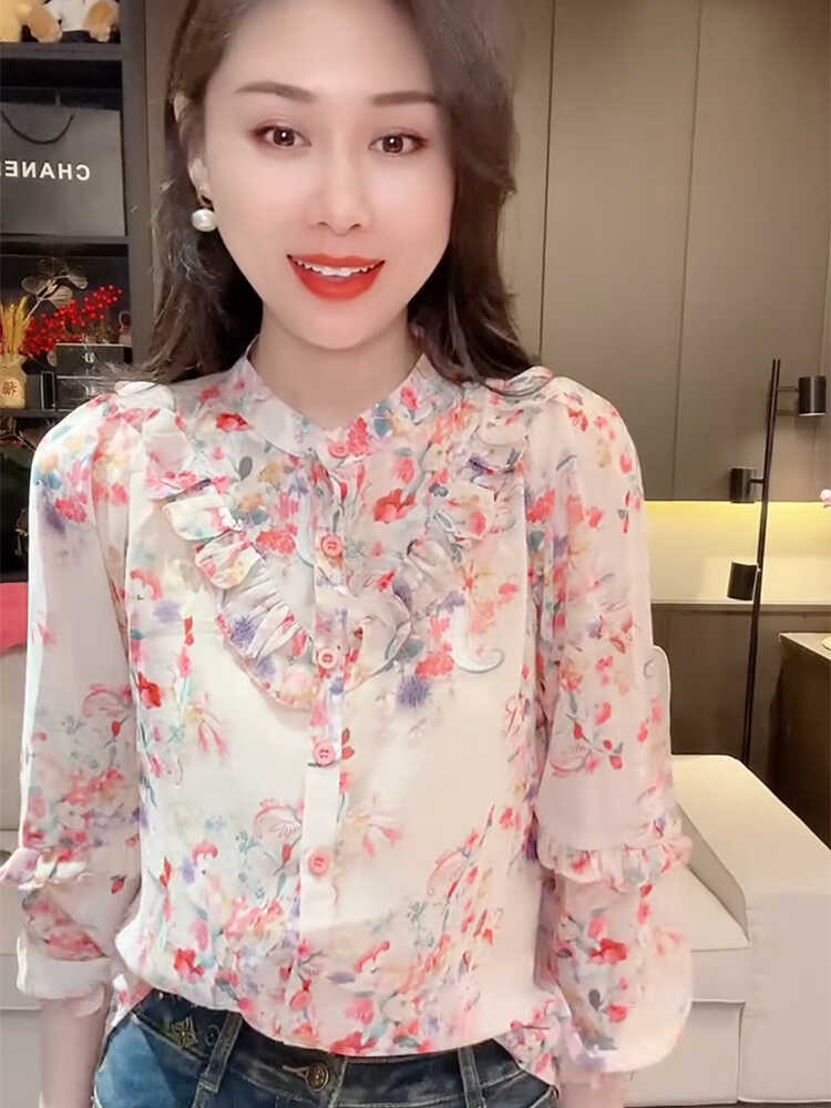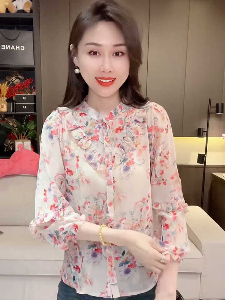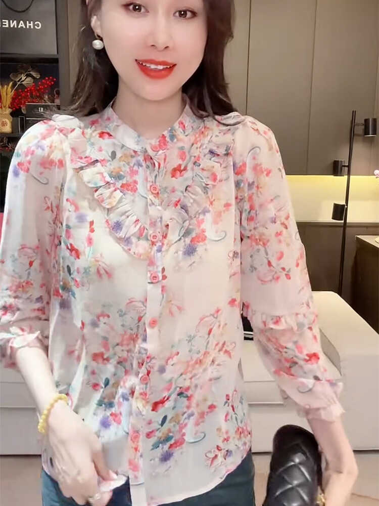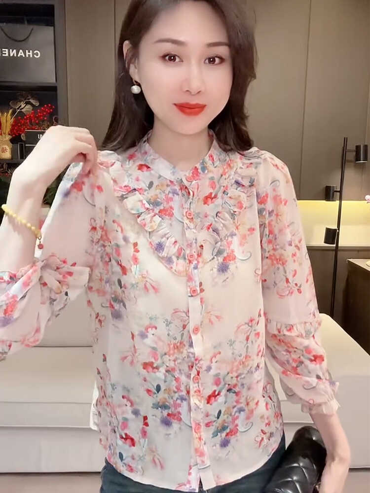 欧货高级感碎花木耳边长袖衬衫女早秋季新款时尚洋气绝美粉色衬衣