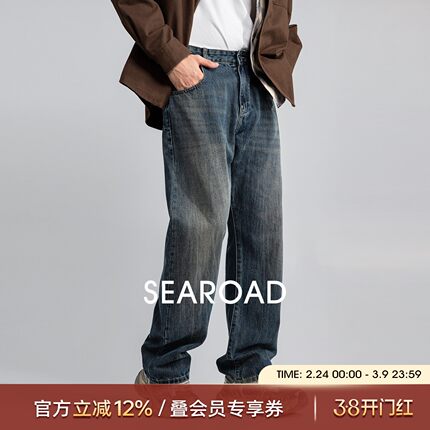 海上公路水洗复古弯刀牛仔裤男款美式高街阔腿直筒百搭休闲长裤子