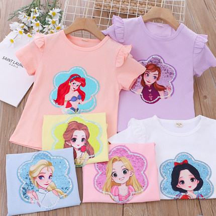 女童纯棉卡通公主亮片短袖T恤 夏季薄款儿童宝宝女孩洋气圆领上衣
