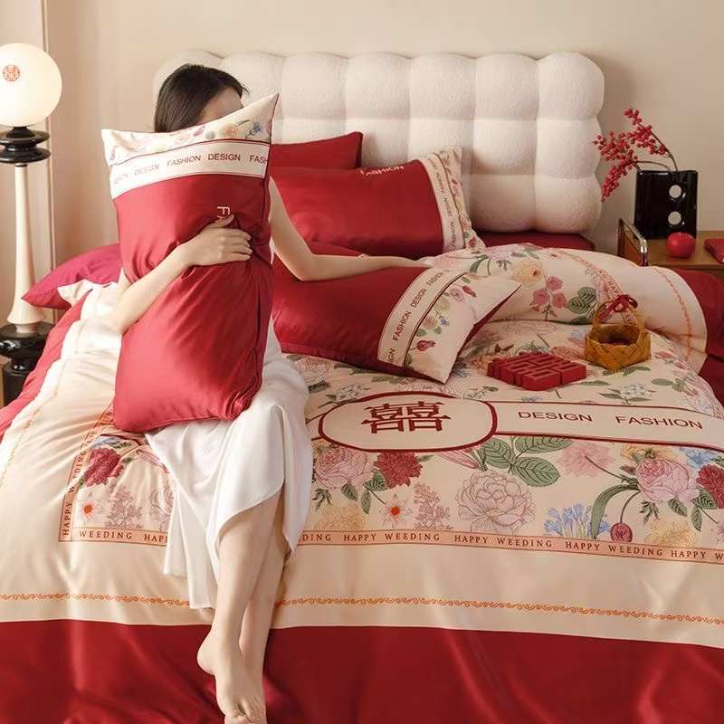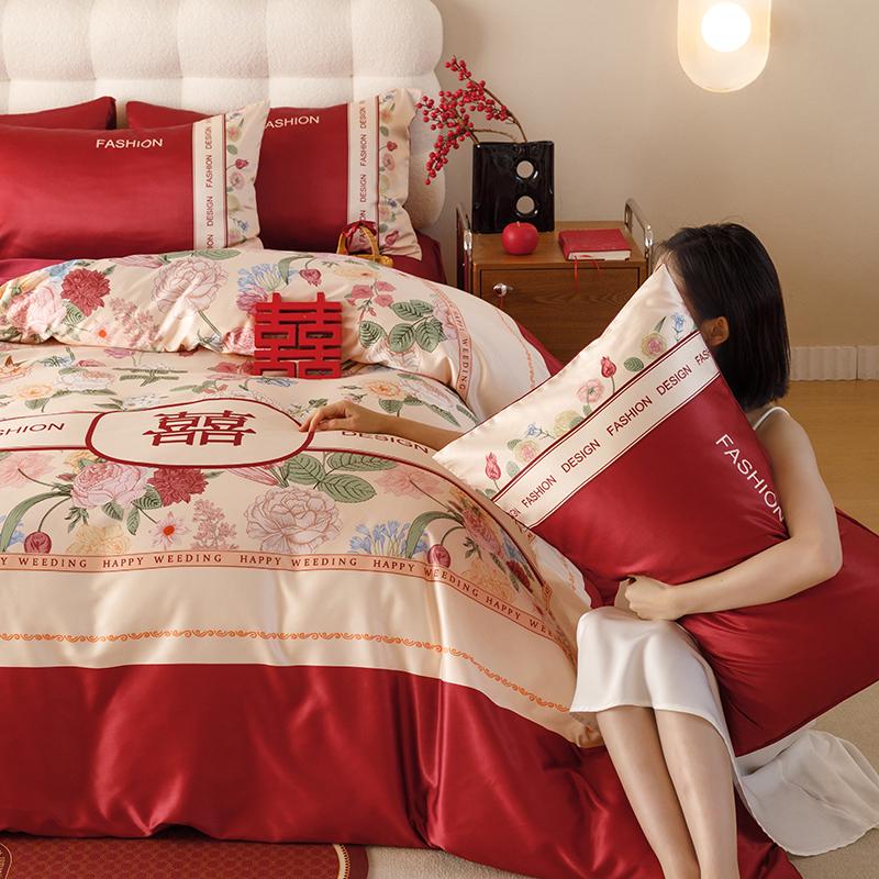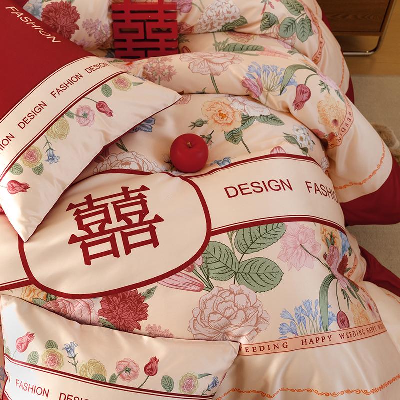 轻奢结婚四件套中式印花高级感红色被套喜庆新婚婚庆陪嫁床上用品
