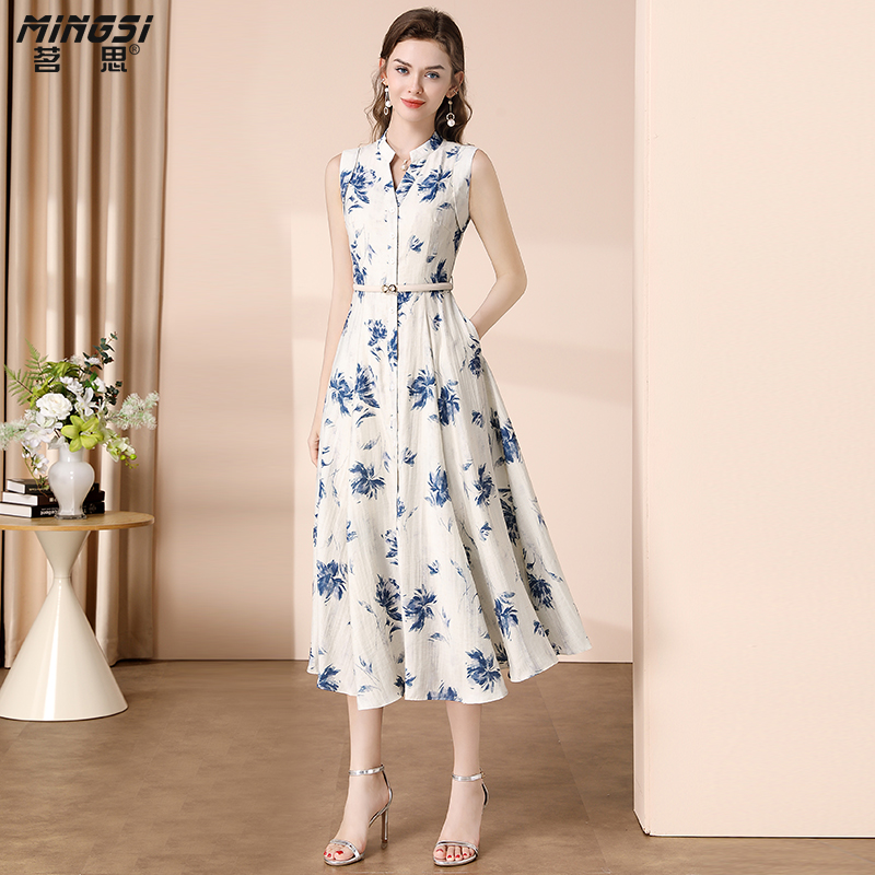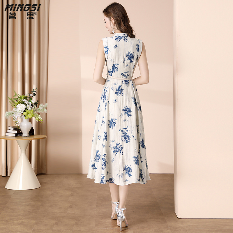 茗思V领无袖气质连衣裙女夏季2025新款今年流行收腰含麻印花长裙