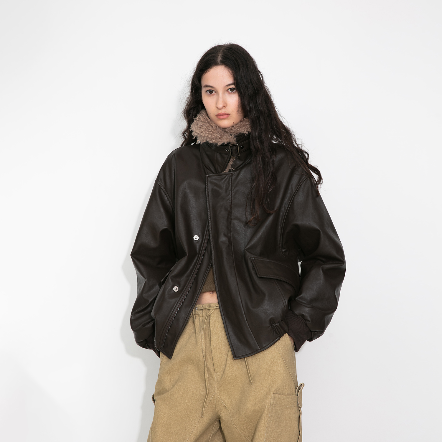 【nana同款】CUBIC白鸭绒宽松棕色毛领短款皮衣羽绒服外套EC6003