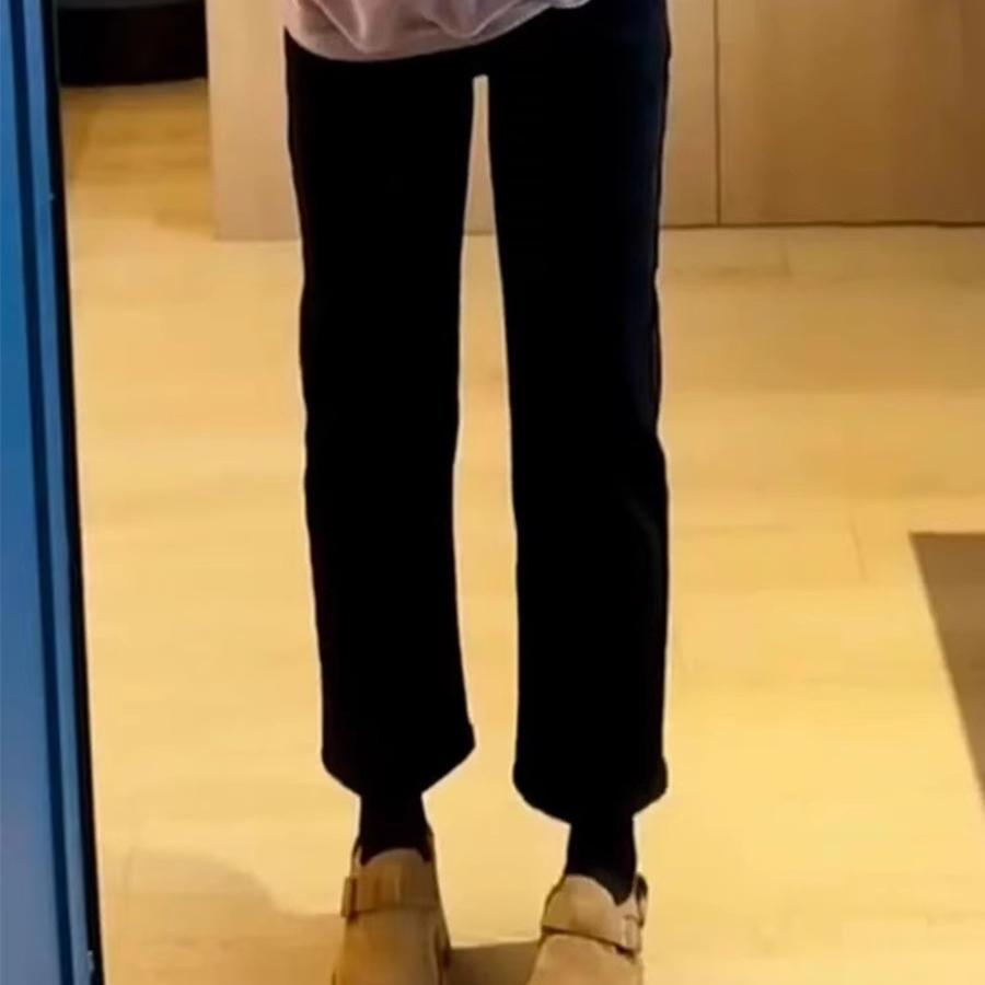 黑色加绒直筒牛仔裤女秋冬新款高腰大码胖MM显瘦九分烟管阔腿裤子
