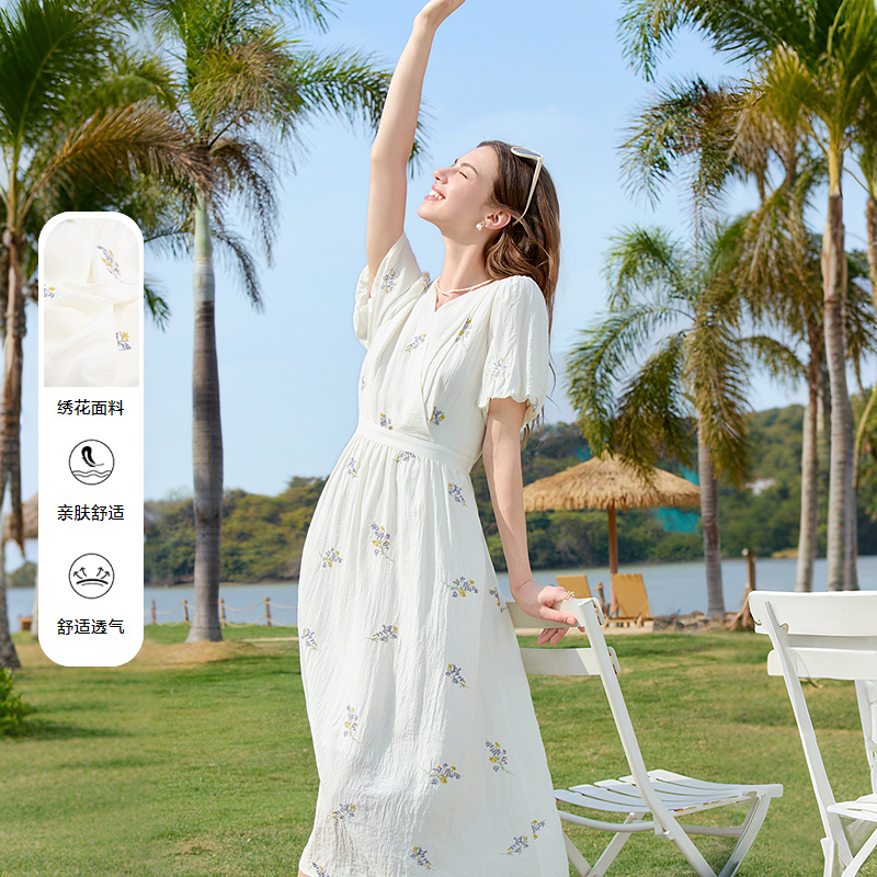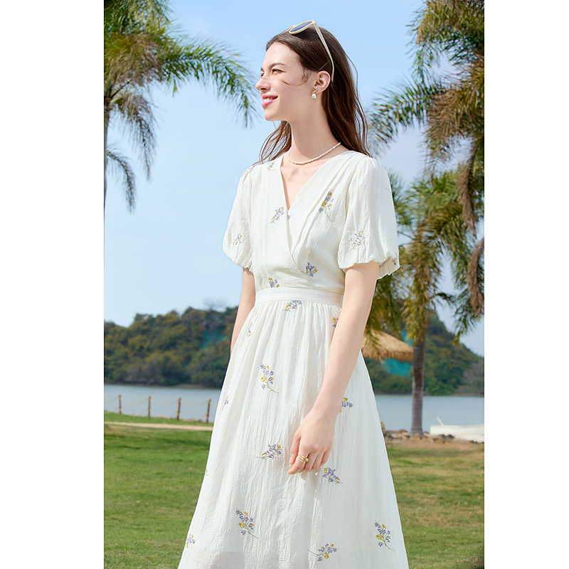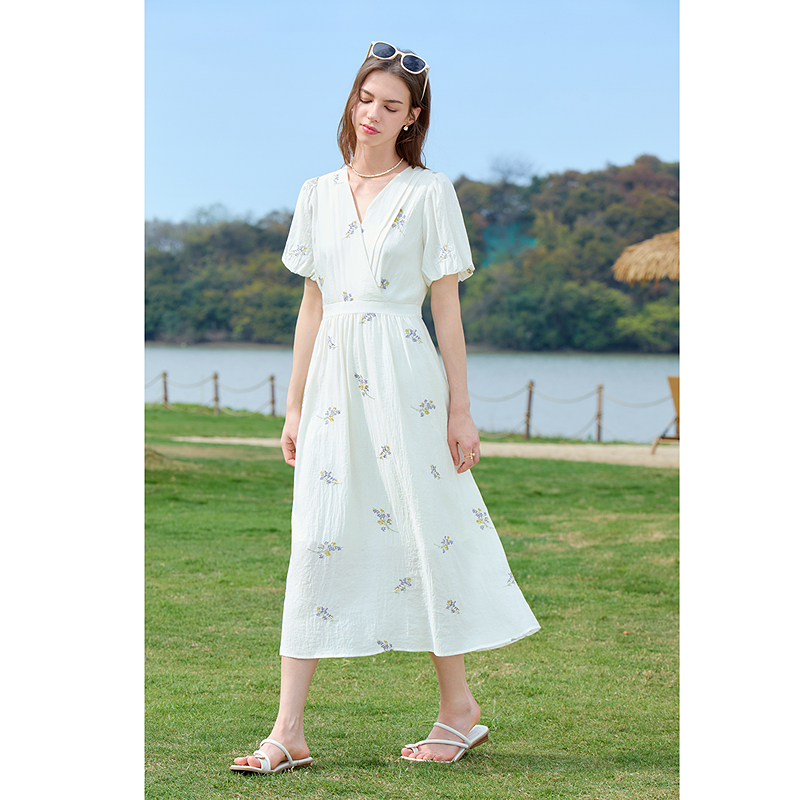 百图betu新款法式V领绣花裙灯笼袖中长款茶歇裙连衣裙