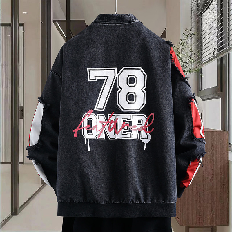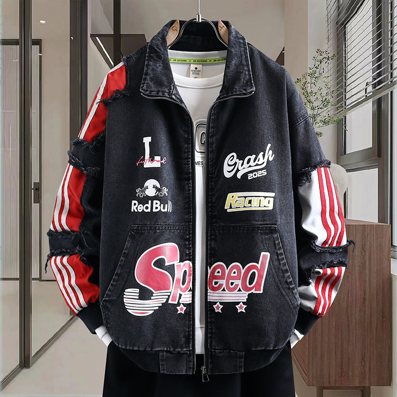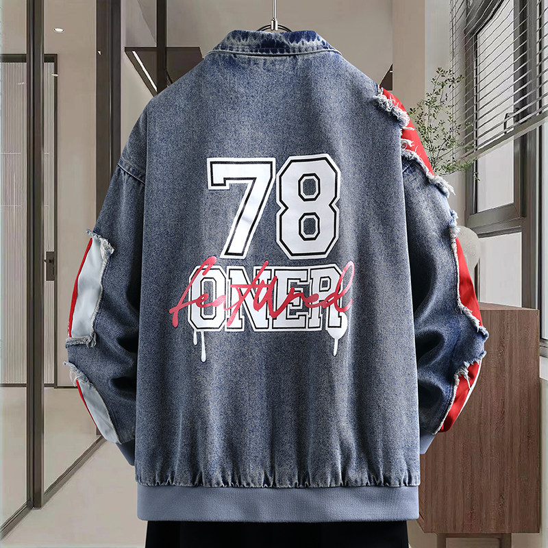 2026春秋新款潮牌街头风牛仔拼接外套个性印花装饰宽松有型夹克