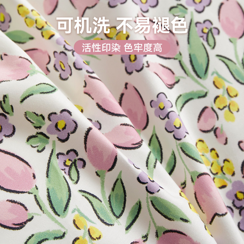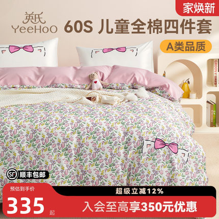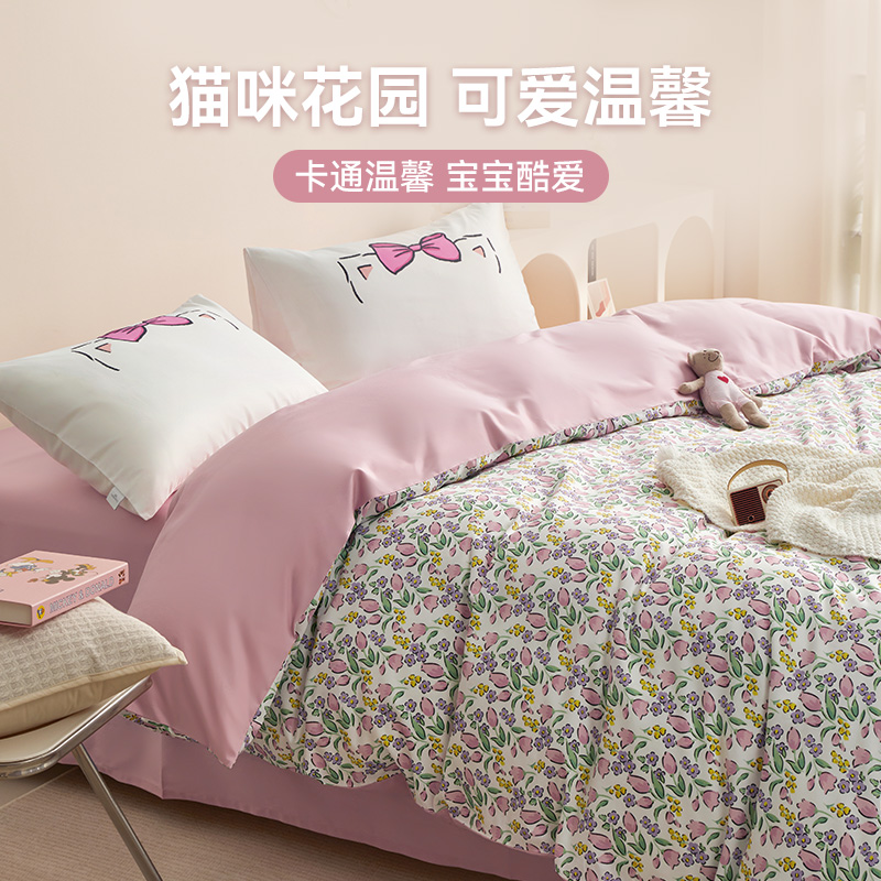 英氏儿童四件套纯棉贡缎夏天宿舍三件套床上床品被套卡通猫咪花园
