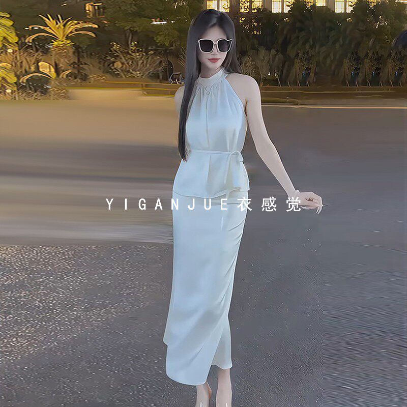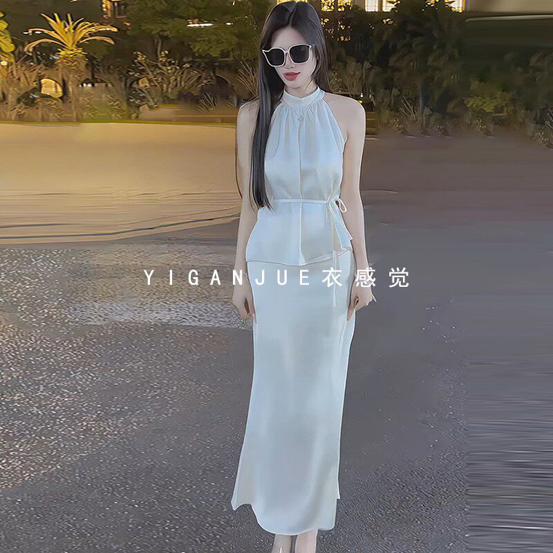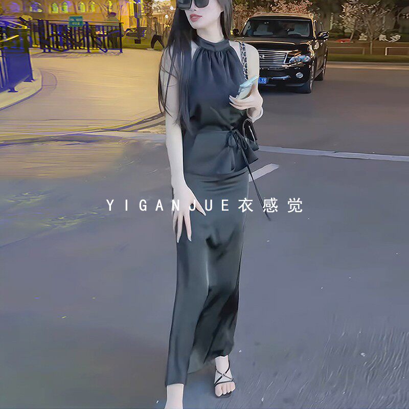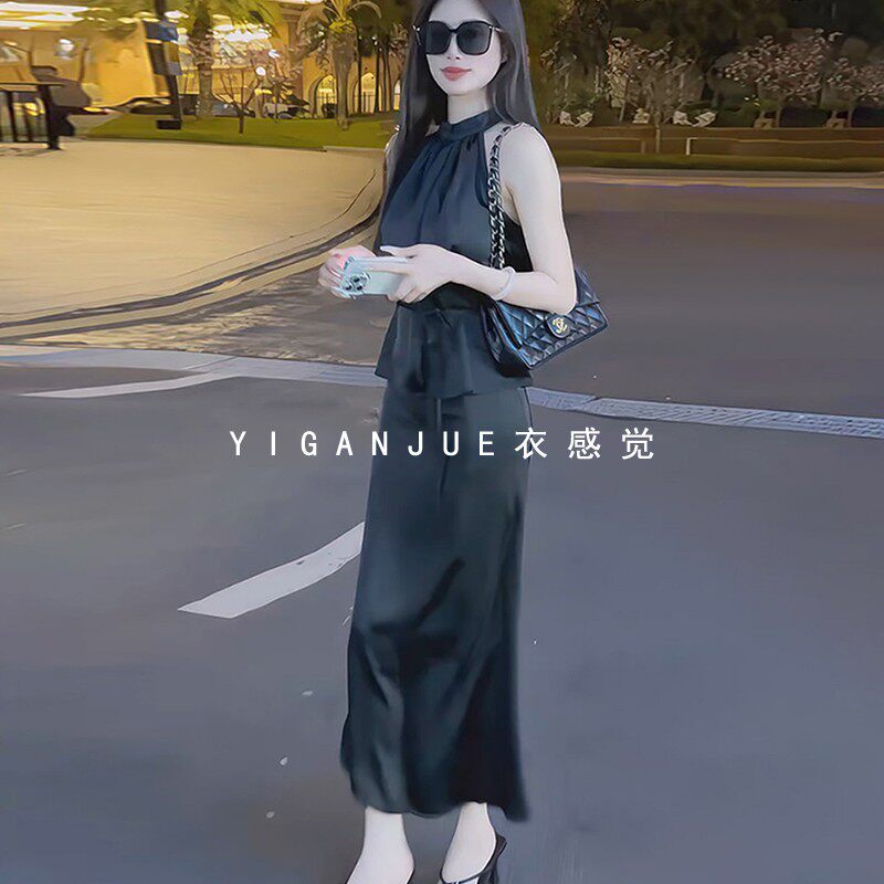 法式高级感醋酸缎面挂脖吊带背心上衣名媛两件套装女鱼尾裙半身裙