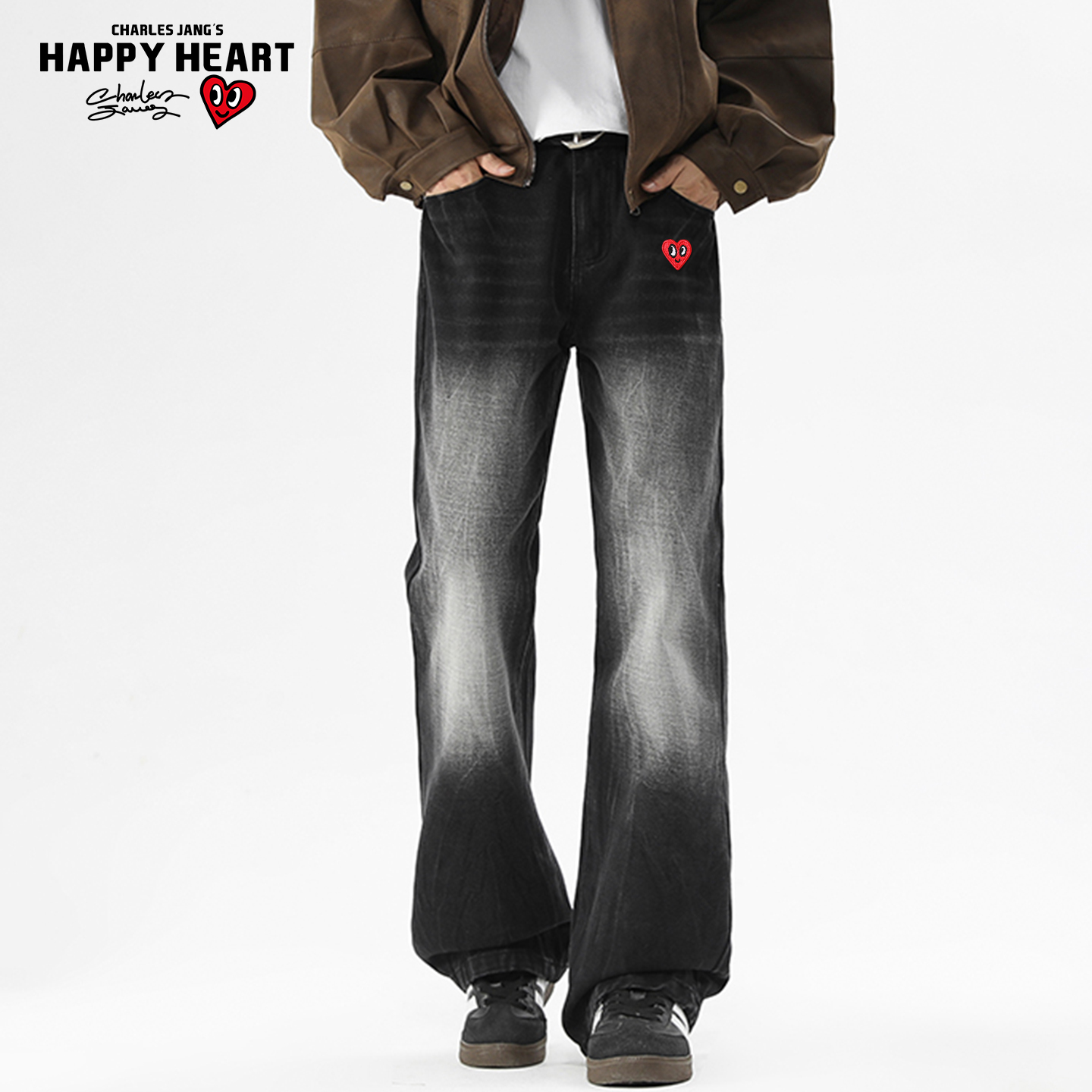 查尔斯桃心微喇牛仔裤男秋冬季新款水洗复古宽松直筒显瘦高街长裤