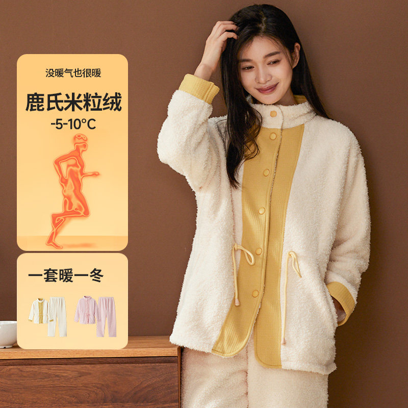 秋鹿【超柔软】珊瑚绒睡衣女秋冬季加绒加厚米粒绒立领家居服套装