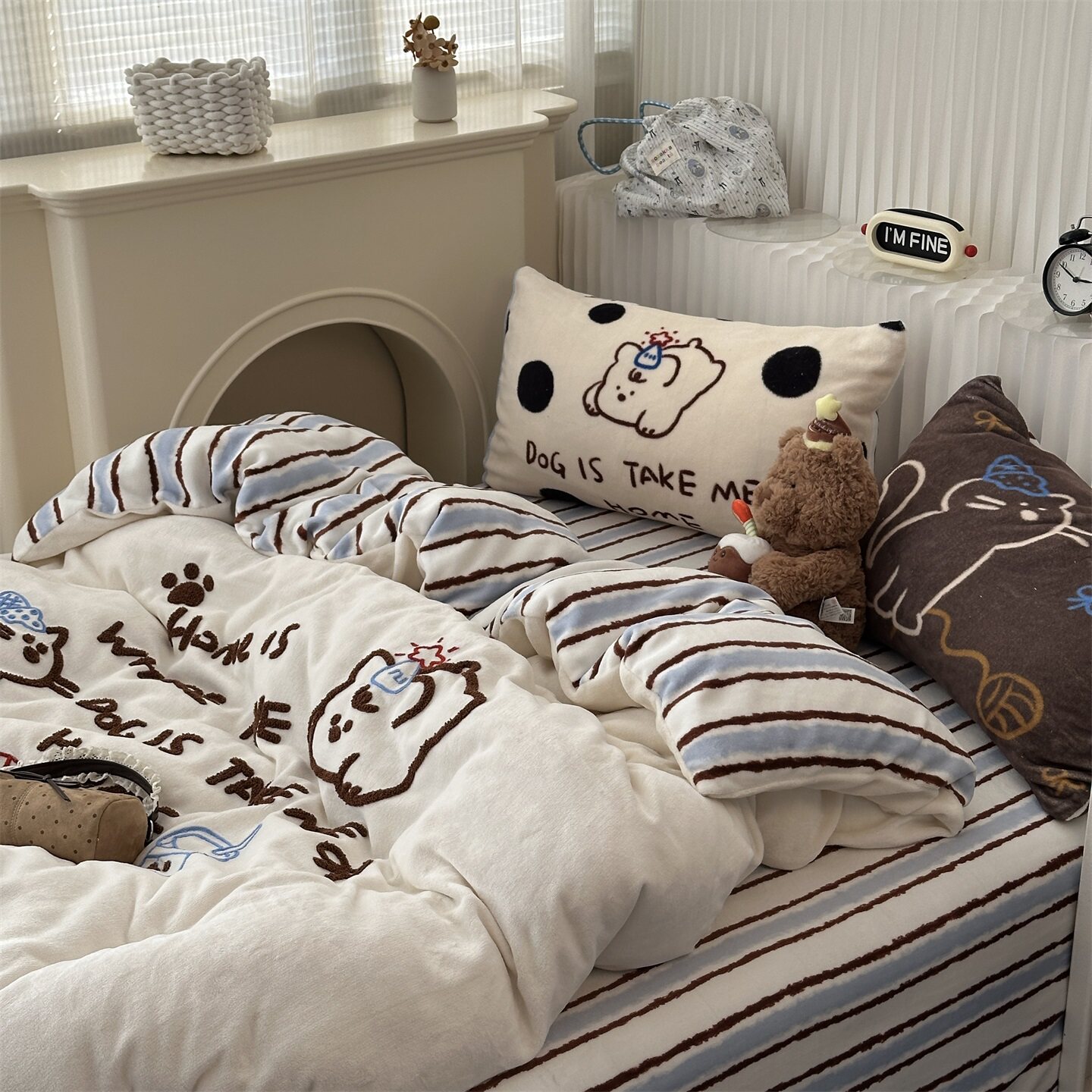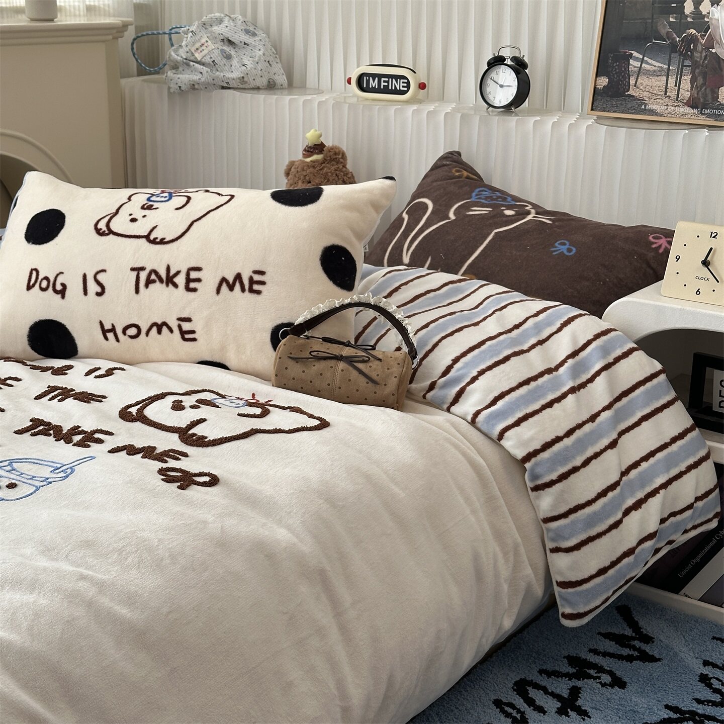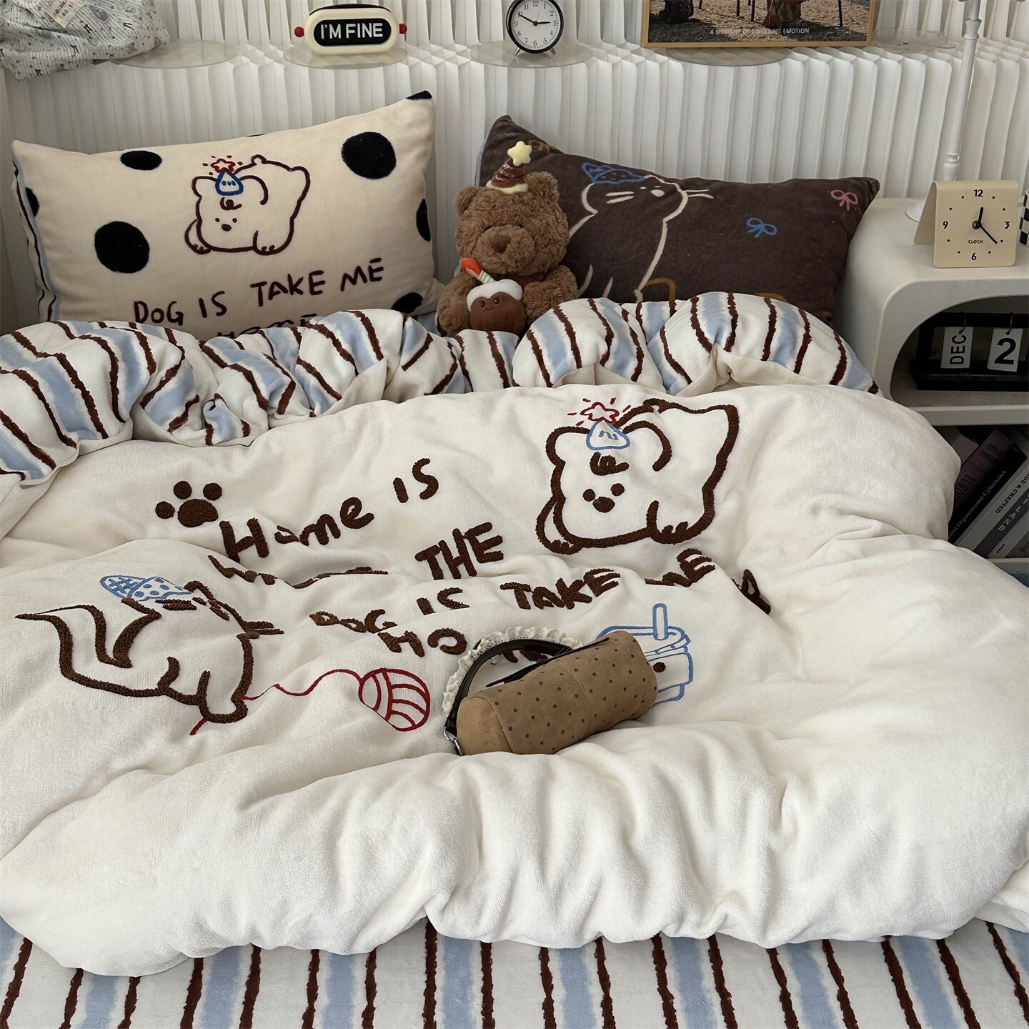 卡通ins少女条纹狗狗猫猫毛巾绣牛奶绒四件套冬天珊瑚绒三件套1.8