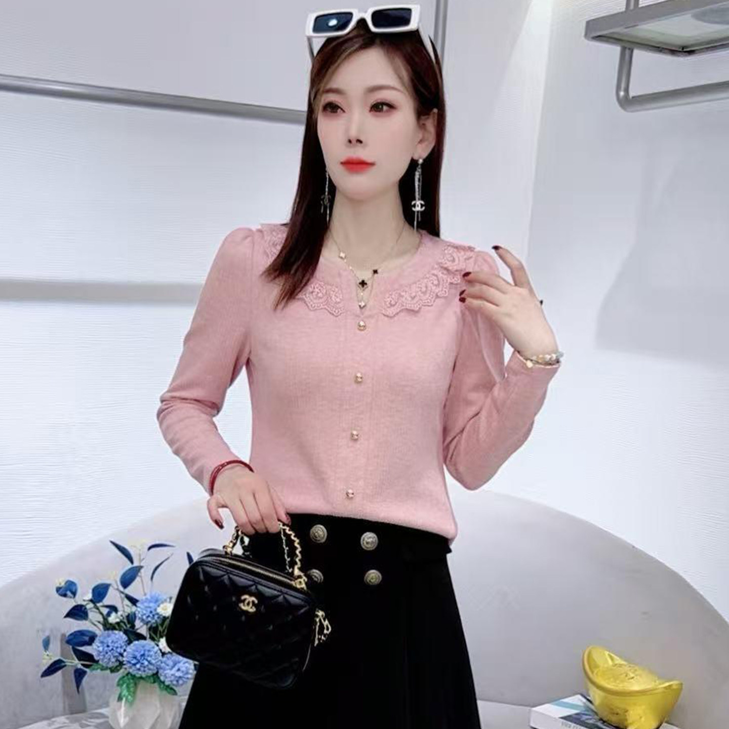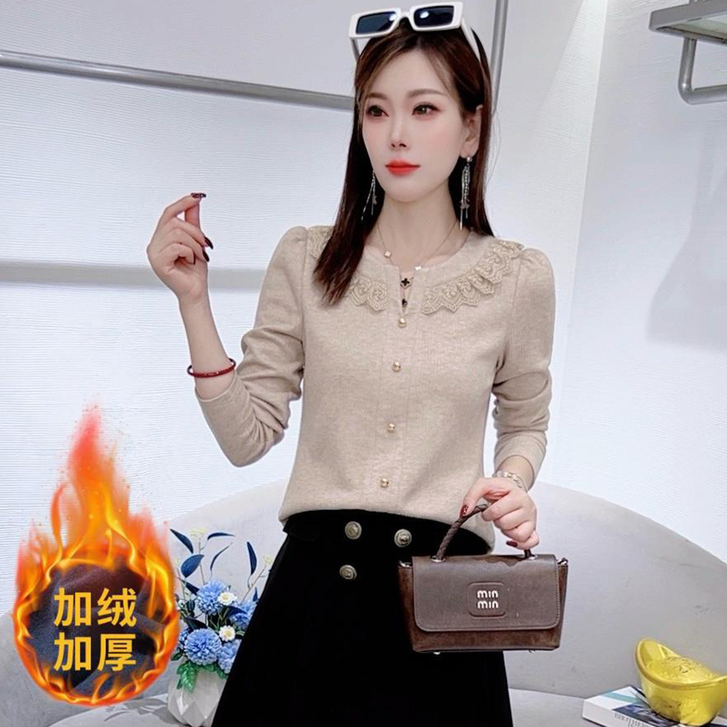 加绒加厚长袖T恤衬衫女秋冬新款时尚洋气圆领蕾丝花边衬衣打底衫