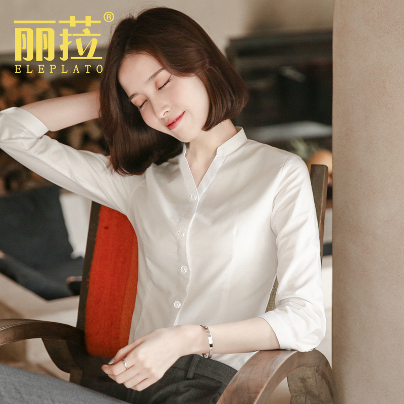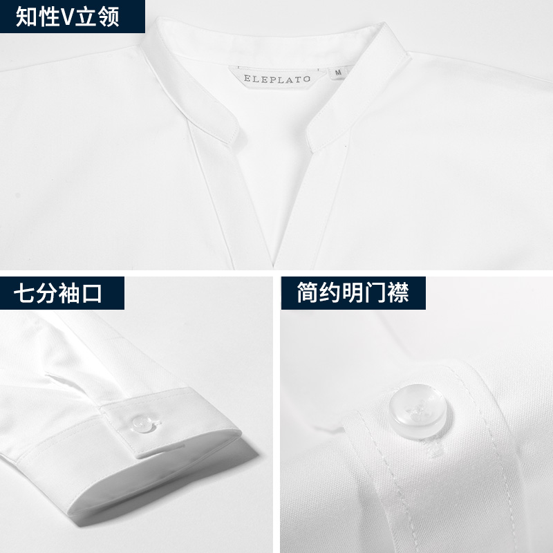 立领白衬衫女中袖面试夏季新款七分袖工作服职业工装薄款v领衬衣