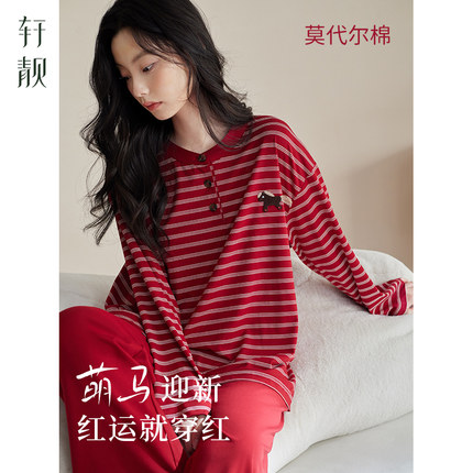 轩靓2026马年莫代尔棉睡衣女春秋条纹红色本命年可外穿家居服套装