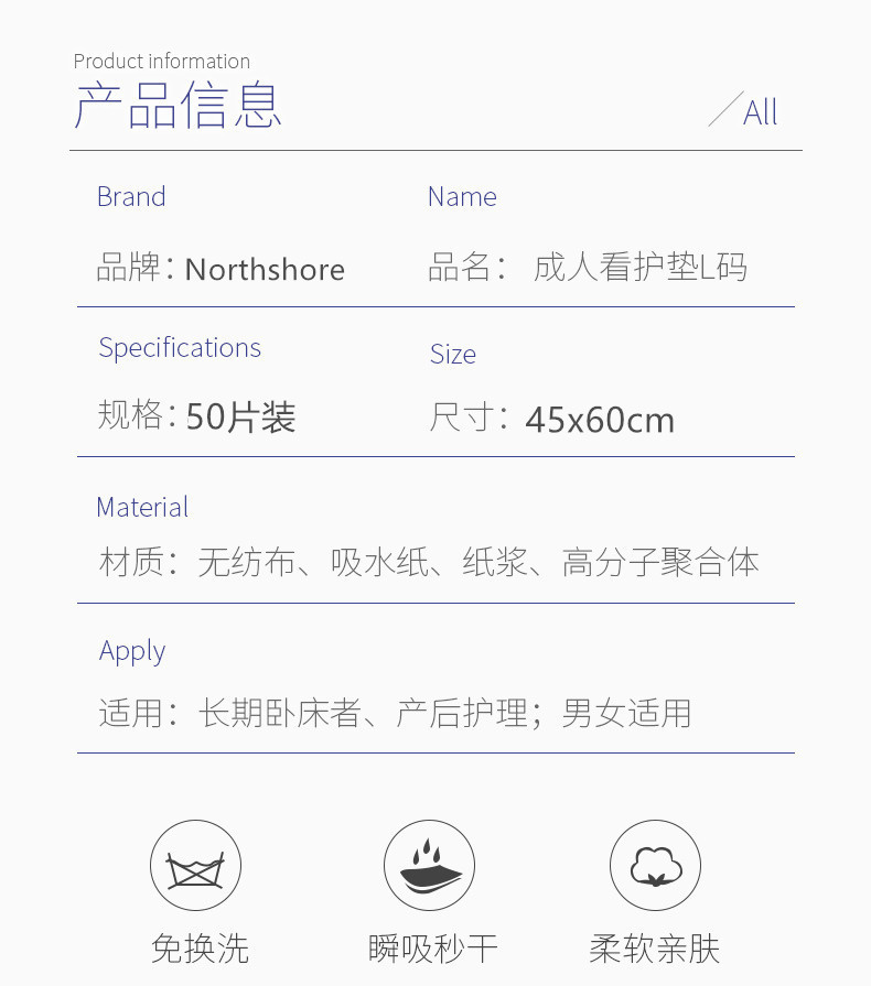 成人护理垫45x60产妇 Northshore隔尿绵尿不湿50片装干爽加厚护垫