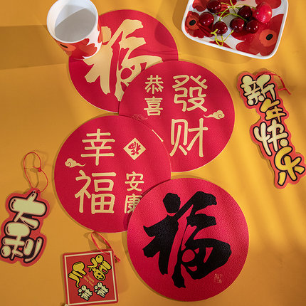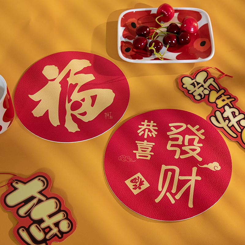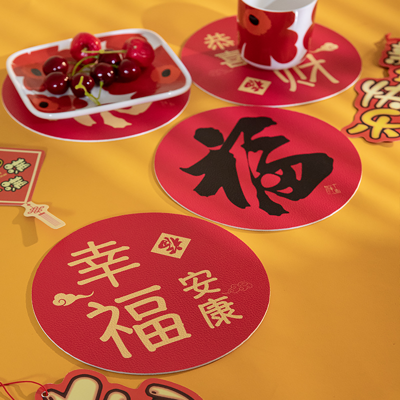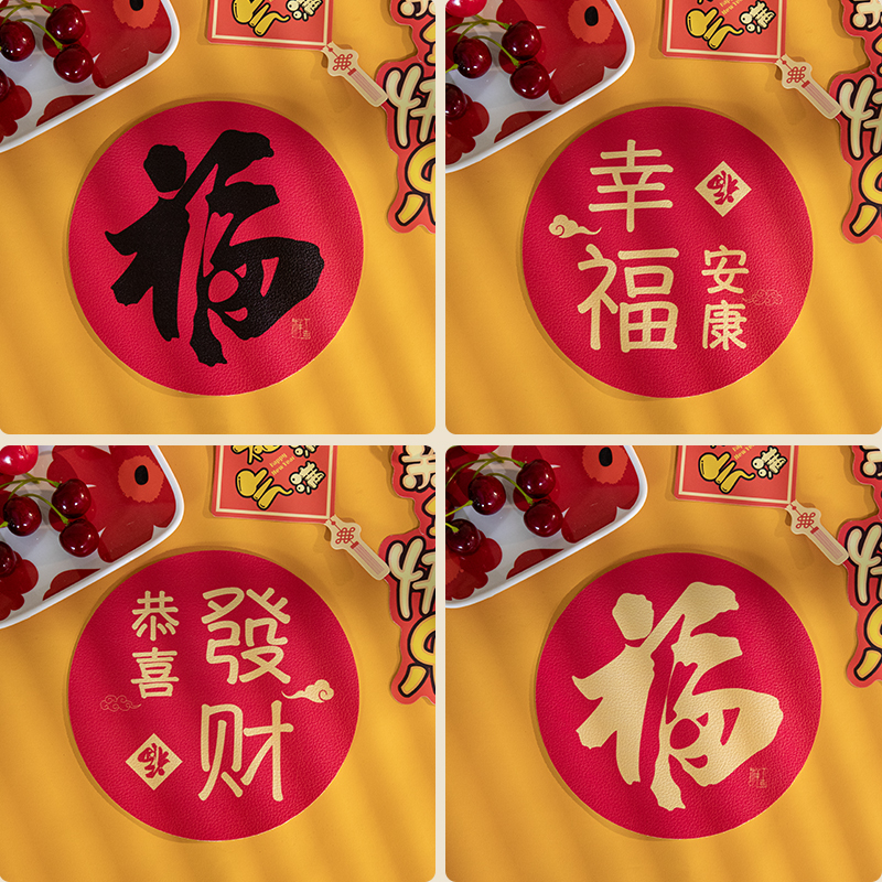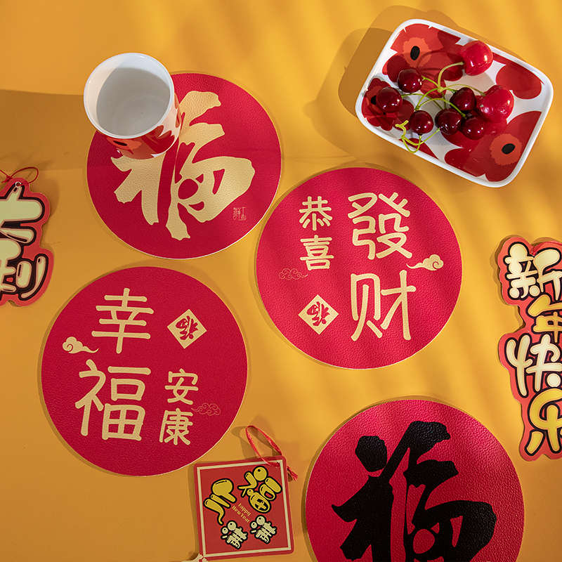 新年福字餐桌隔热垫防水防油碗盘垫圆形红色餐垫水杯垫耐高温垫子