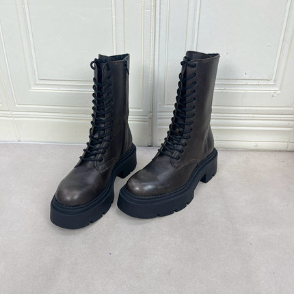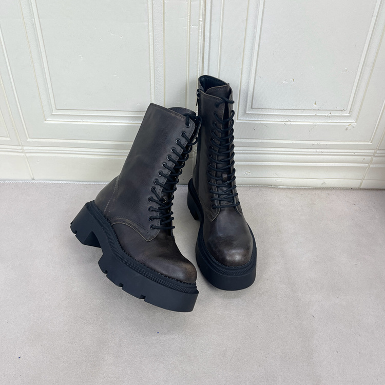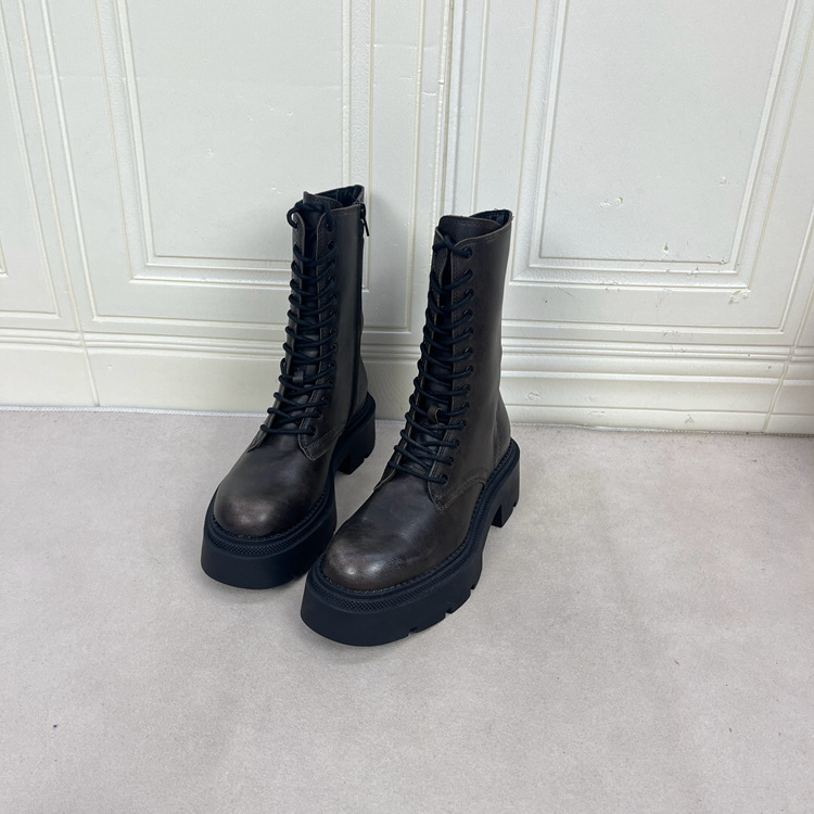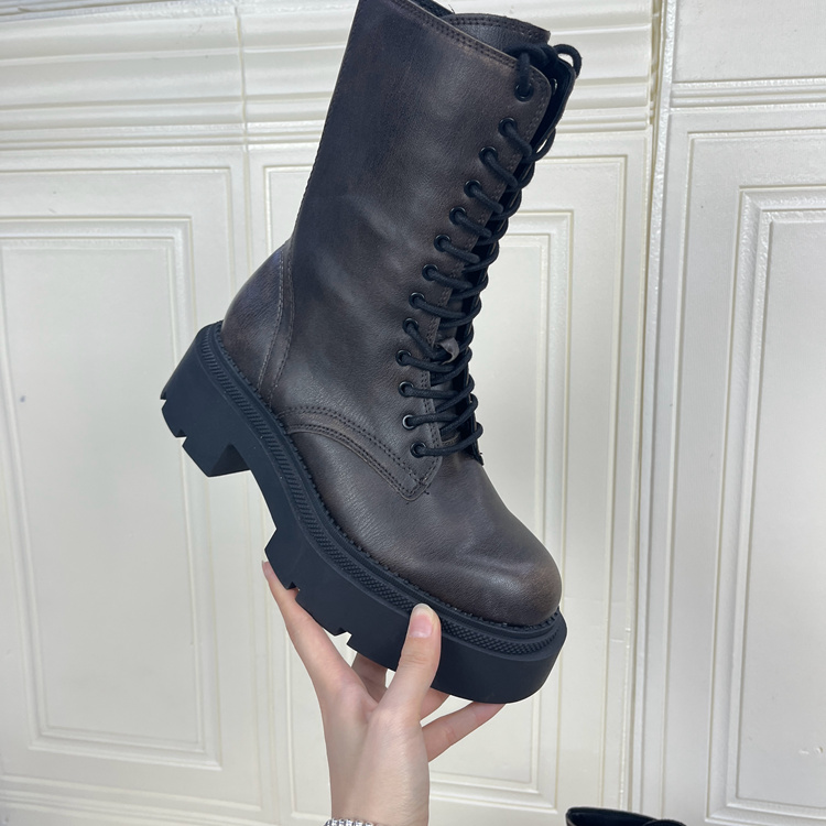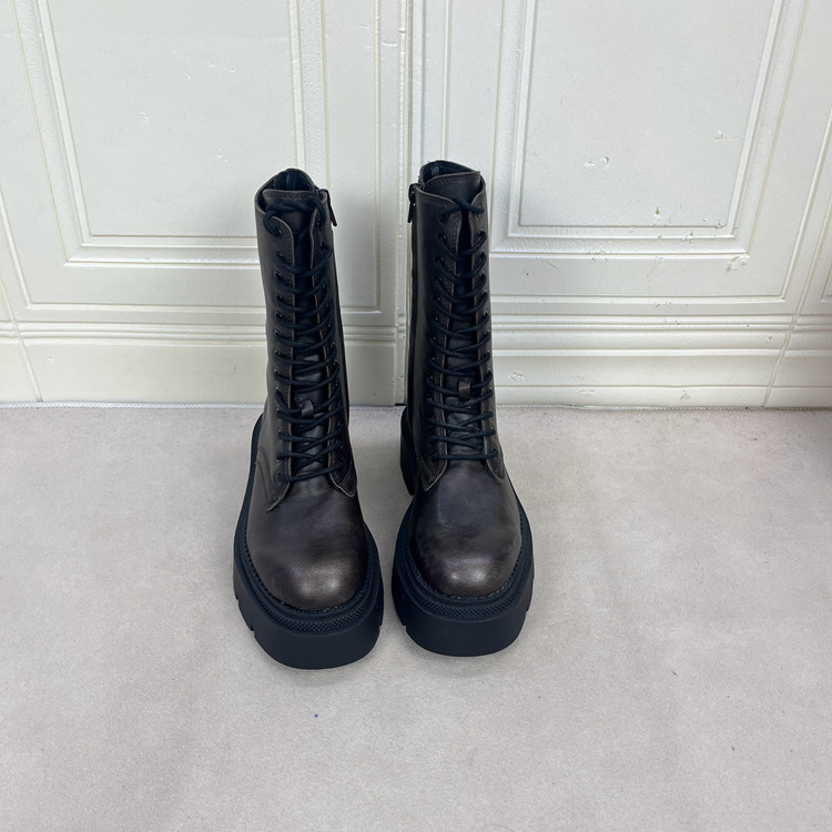 外贸原单女靴圆头纯色厚底粗跟系带侧拉链时尚百搭新款短靴骑士靴
