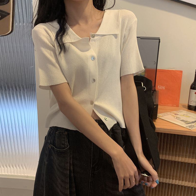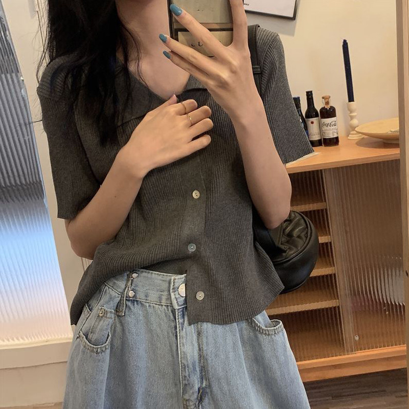 短袖针织衫女开衫女装2025新款夏季polo翻领薄款T恤灰色短款上衣