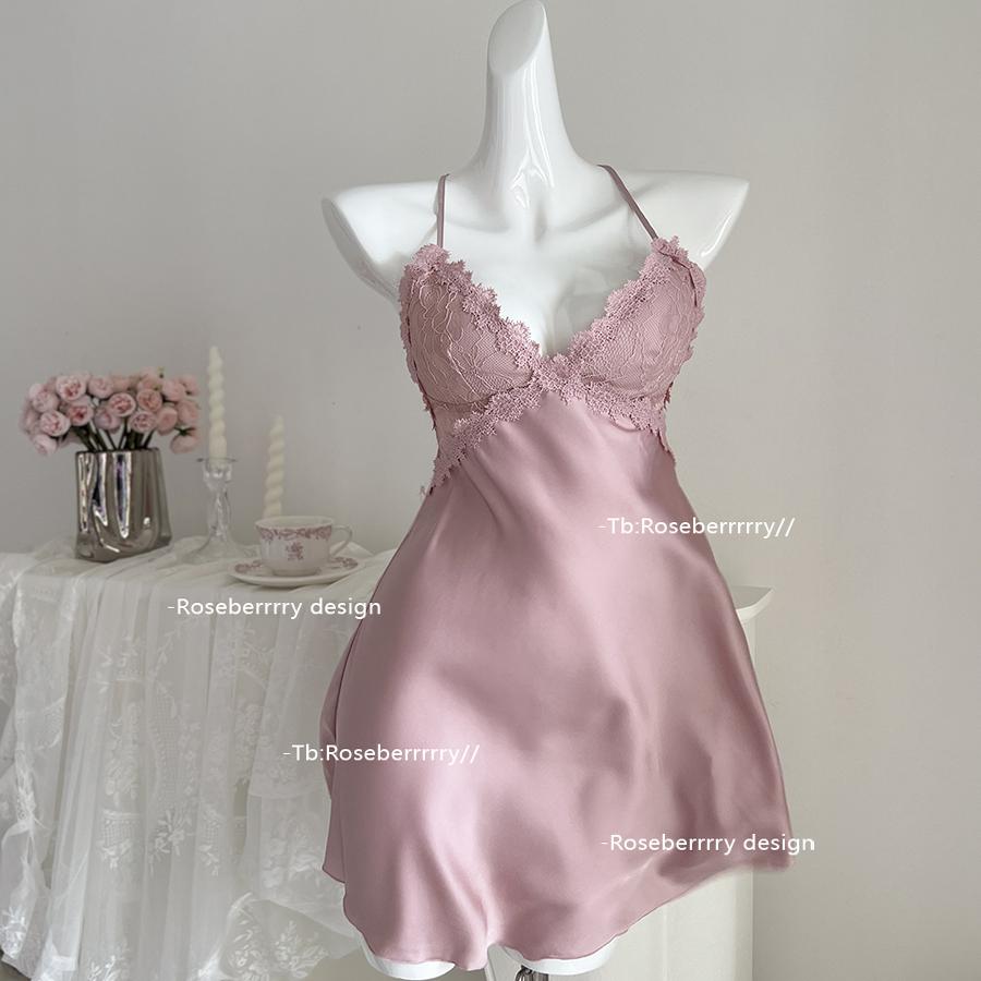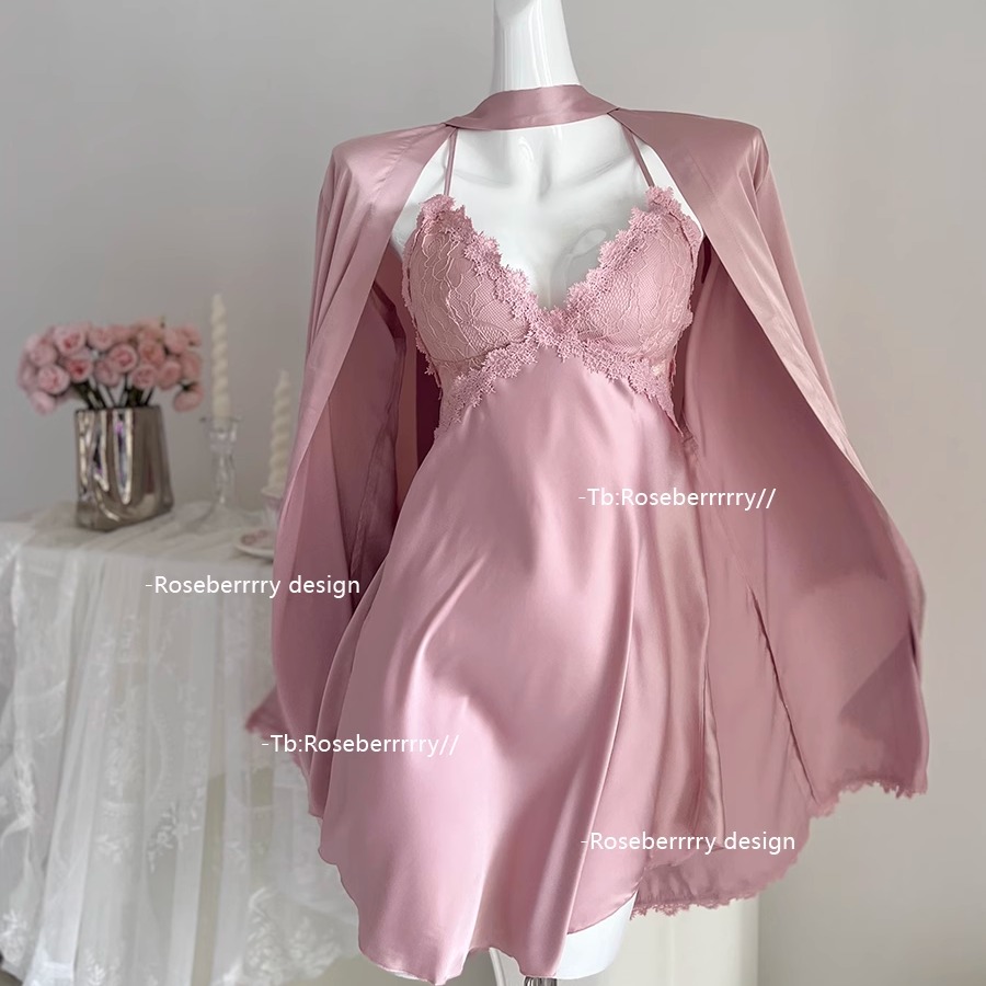 Roseberrrry白月光 性感蕾丝v领吊带裙带胸垫缎面舒适睡裙带外袍