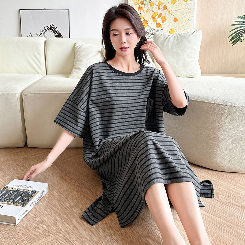 条纹睡裙大码女胖mm夏季薄款纯棉短袖家居裙夏天可外穿睡衣200斤