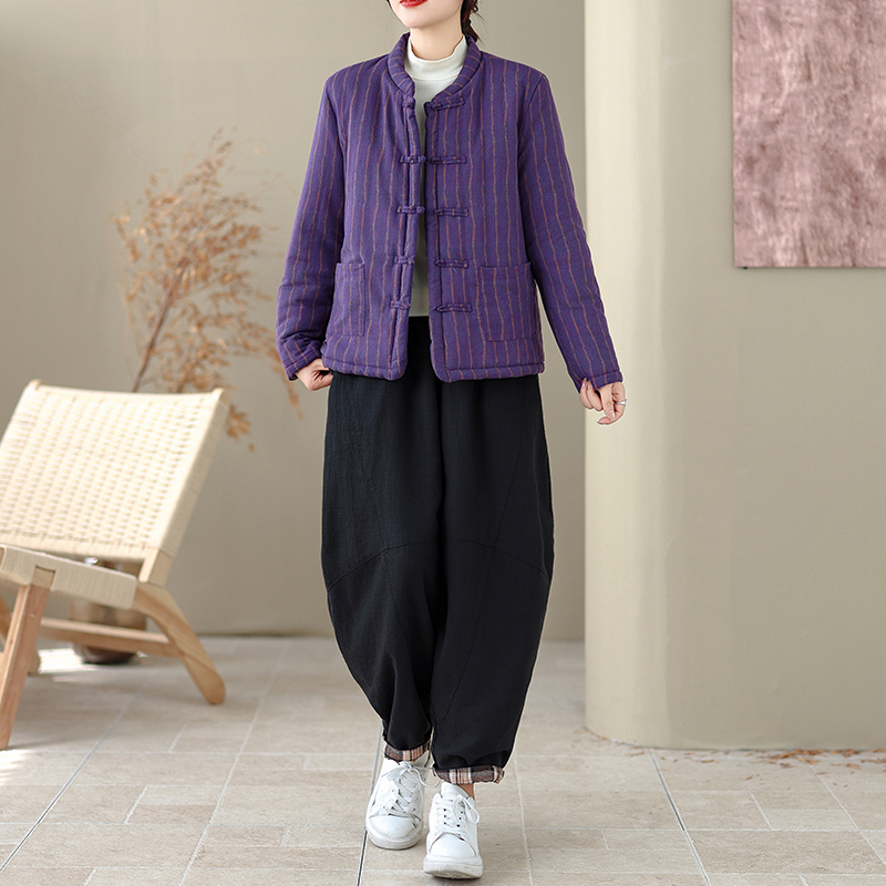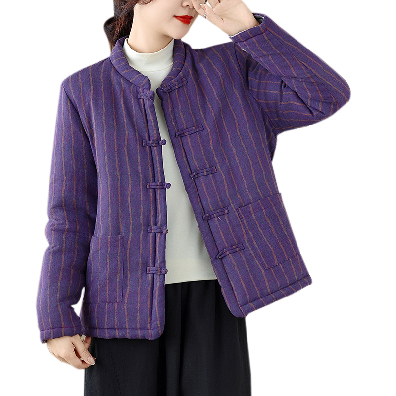 紫色中国风条纹老布禅意加棉加厚棉衣外套女冬季汉服棉麻棉袄上衣