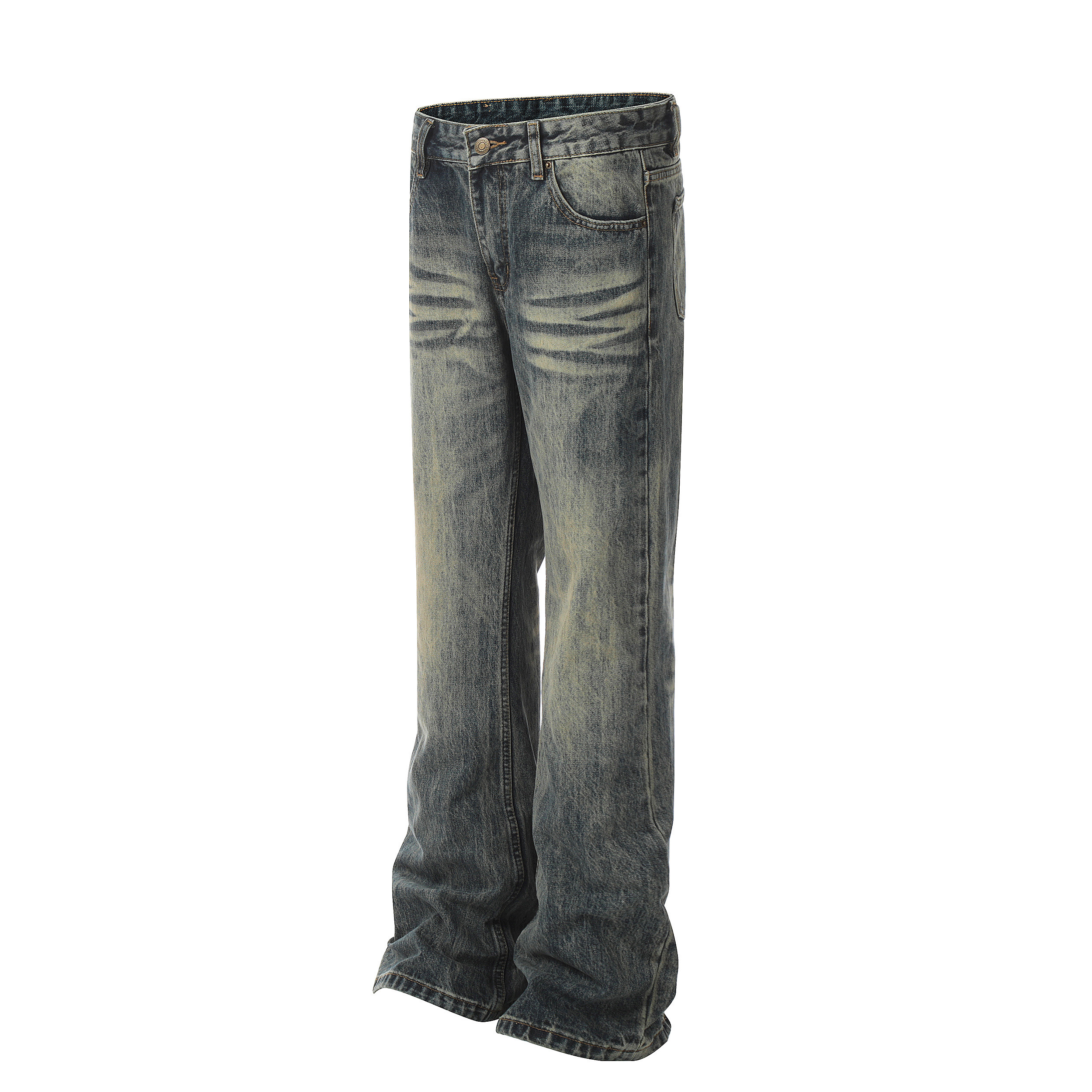 DC+美式高街复古水洗做旧蓝色牛仔裤男女直筒微喇休闲显瘦长裤子
