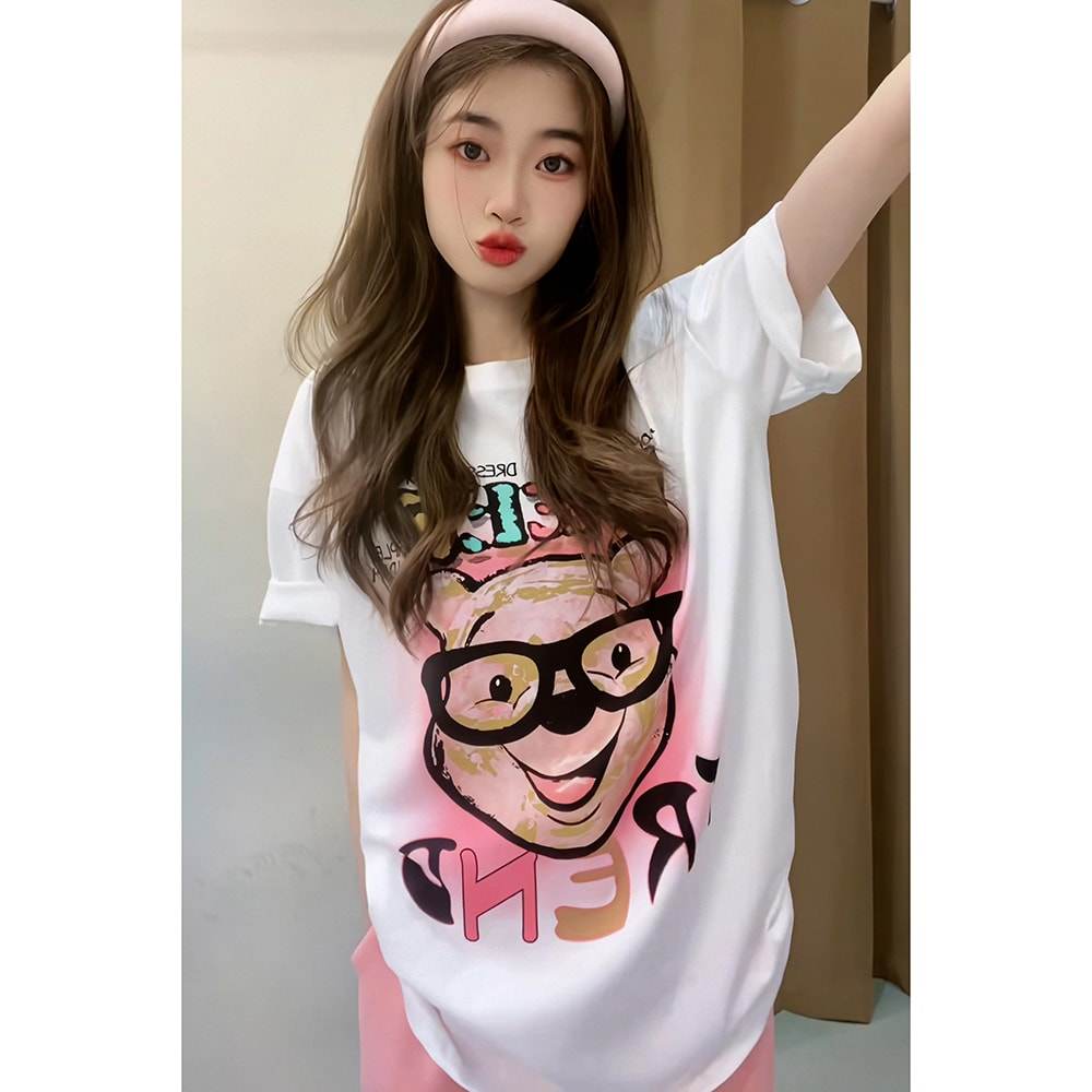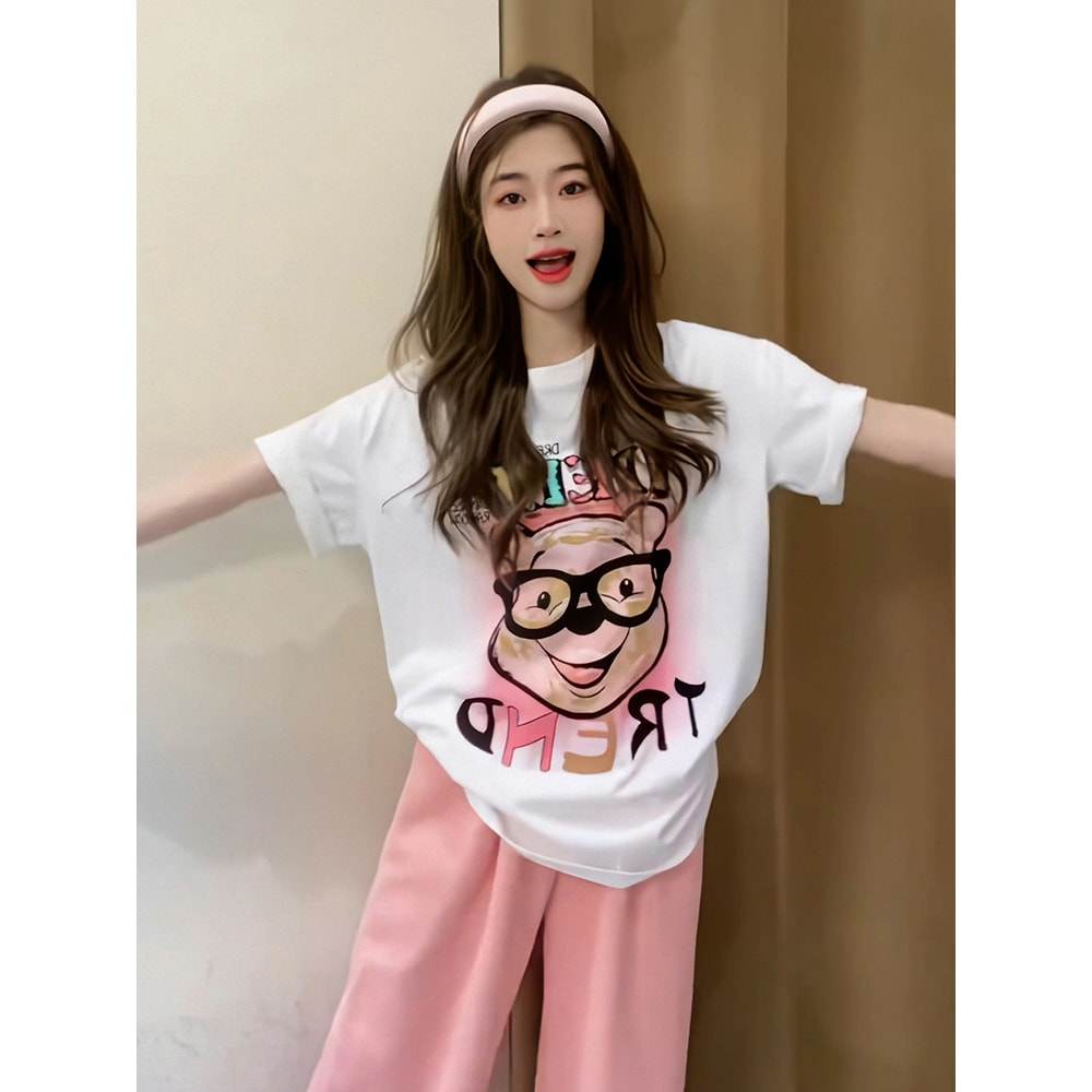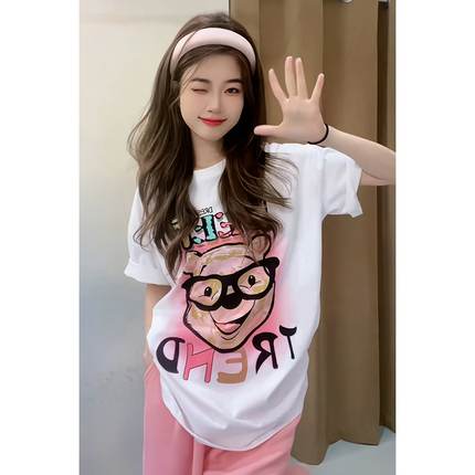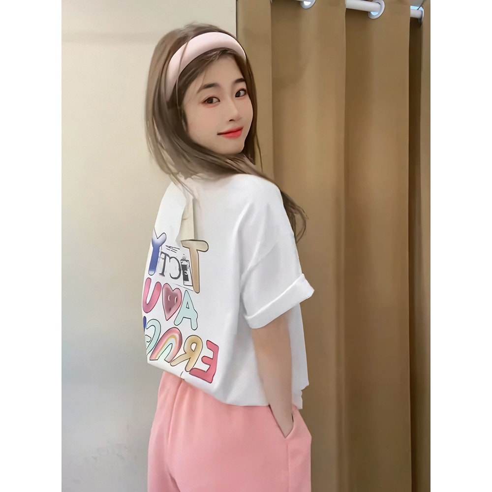 可爱甜美上衣夏季女装2025新款设计感印花宽松显瘦百搭短袖t恤女