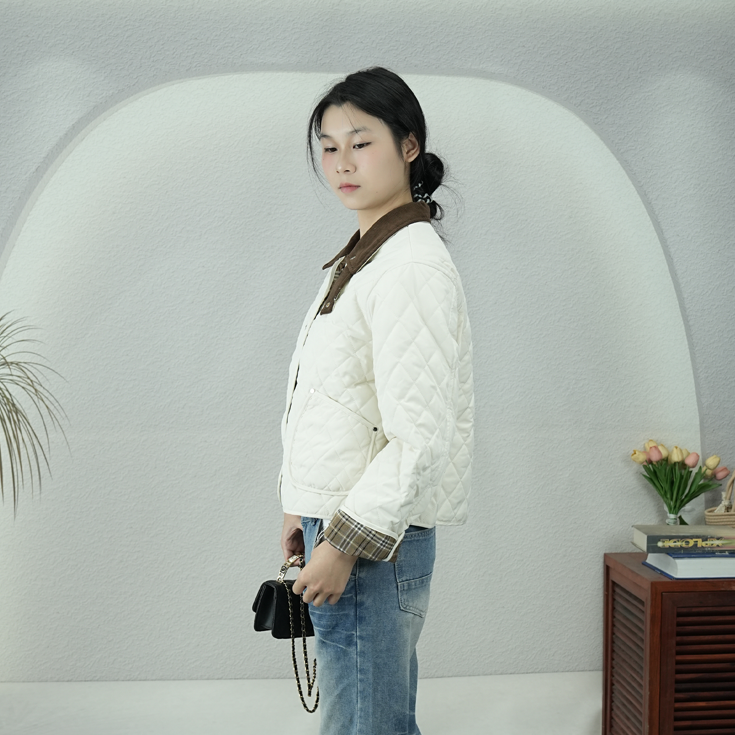 菱格纹翻领女短款棉服外套2025冬