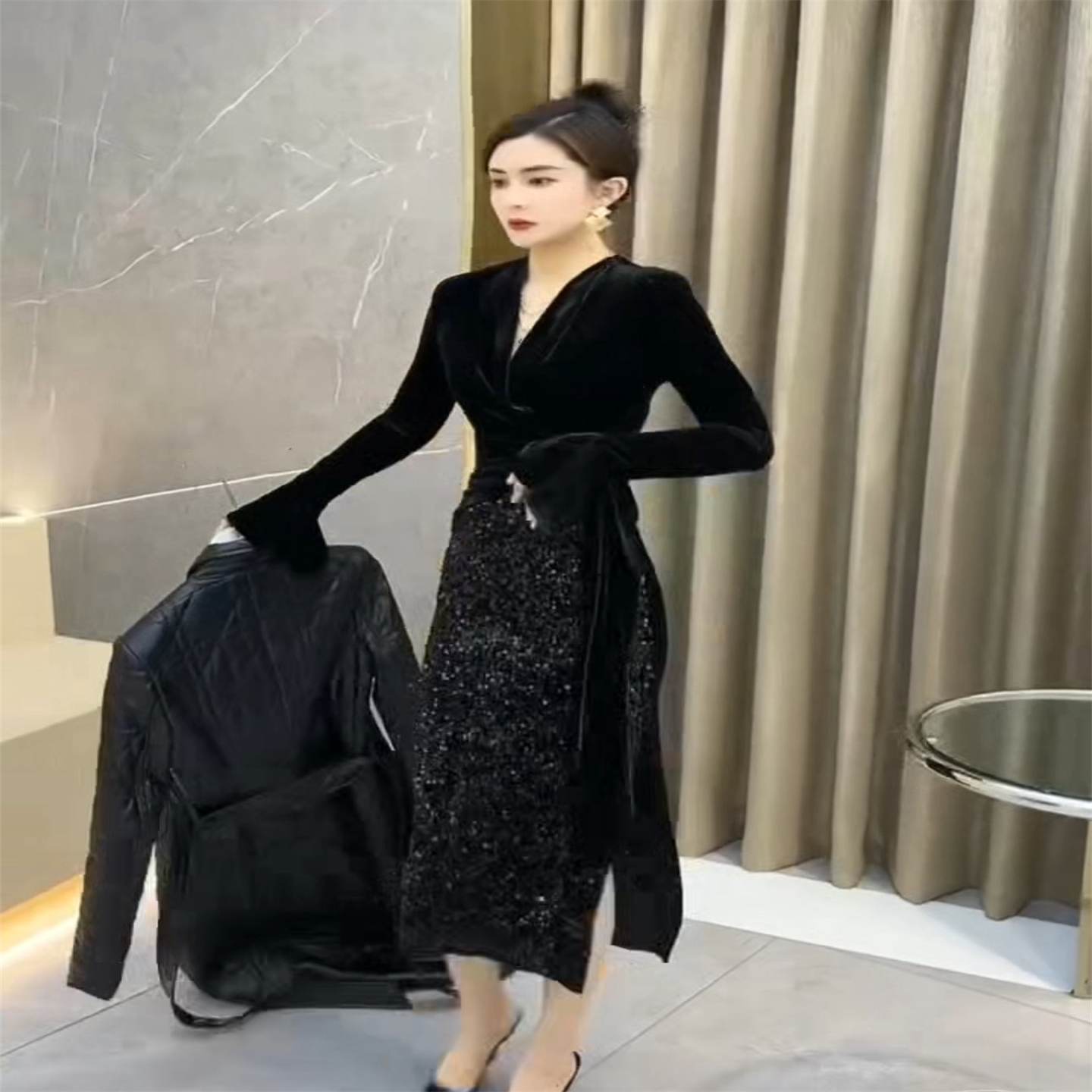 秋冬新款时尚v领长袖金丝绒拼接亮片收腰包臀中长款红色连衣裙女