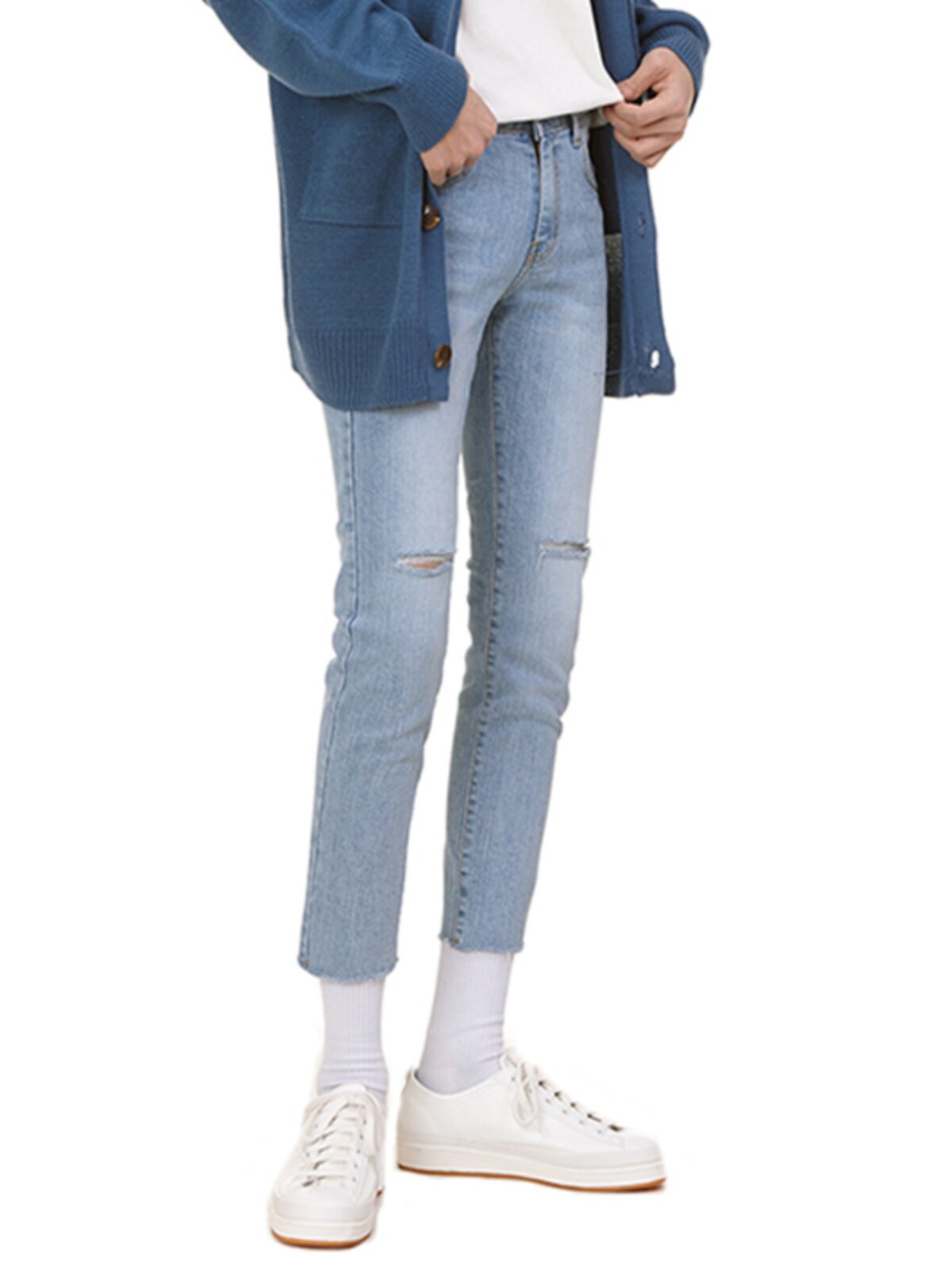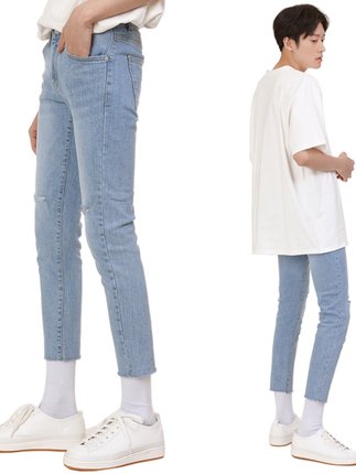 韩国潮牌坠感百搭破洞牛仔裤男9分裤修身小脚裤痞帅男裤子九分裤