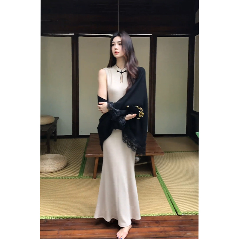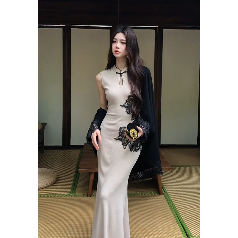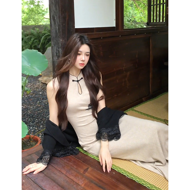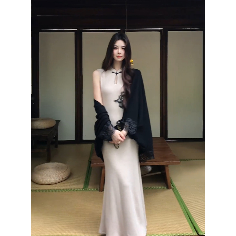 新中式无袖旗袍连衣裙女设计感蕾丝拼接披肩上衣时尚套装
