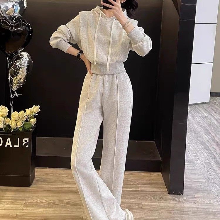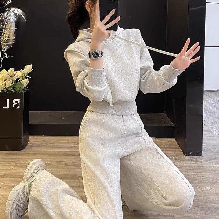 盐系休闲运动套装女秋新款洋气显瘦减龄短款连帽卫衣阔腿裤两件套