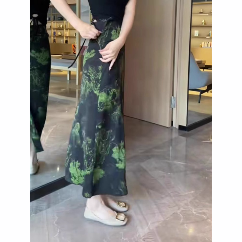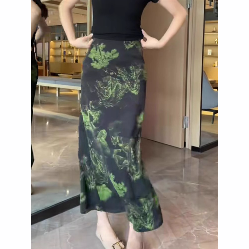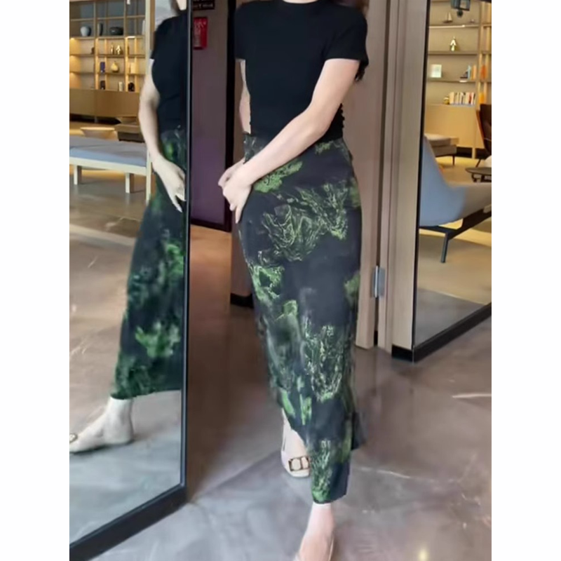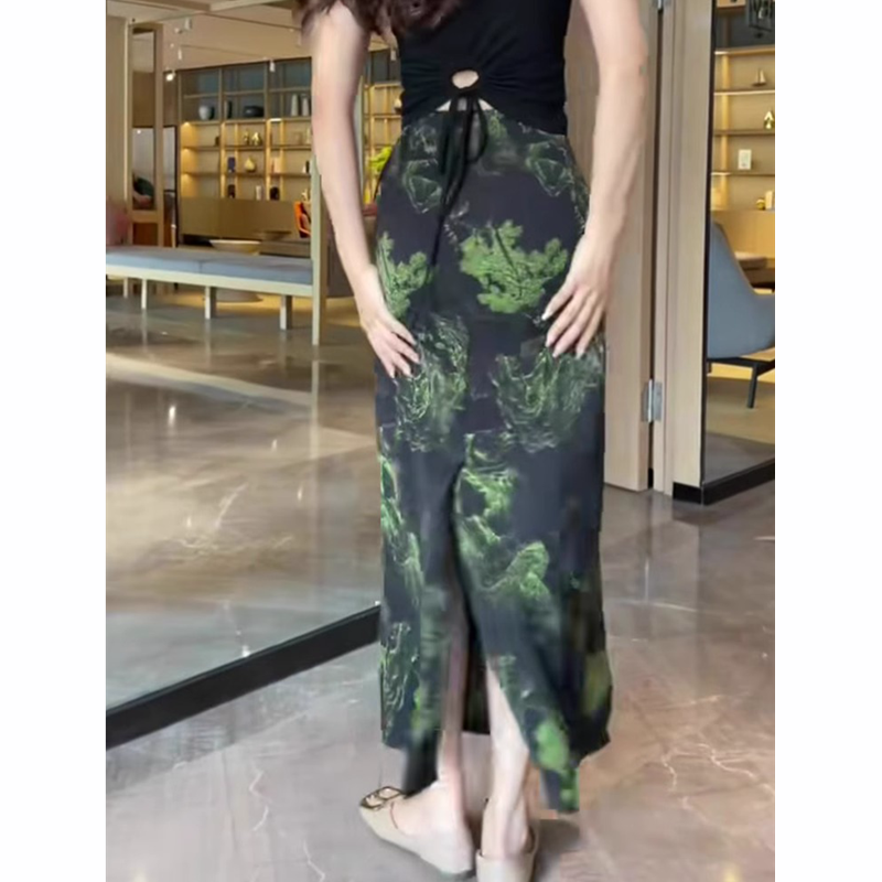 夏季新款休闲后开叉印花半身裙设计感高腰显瘦时尚大码包臀裙子女