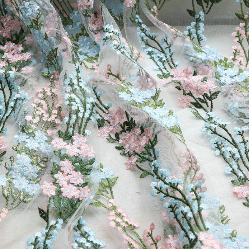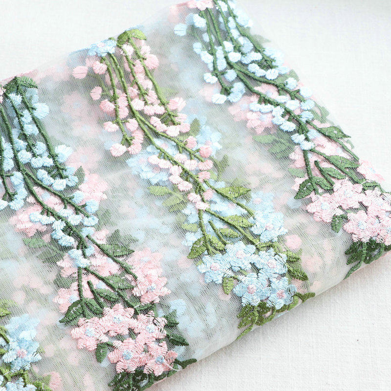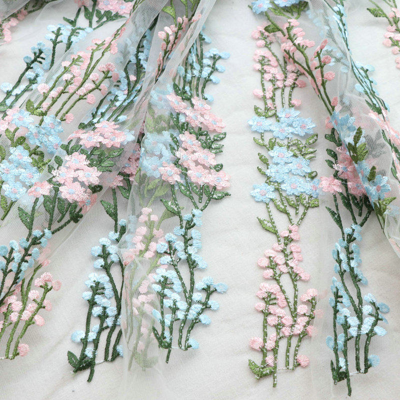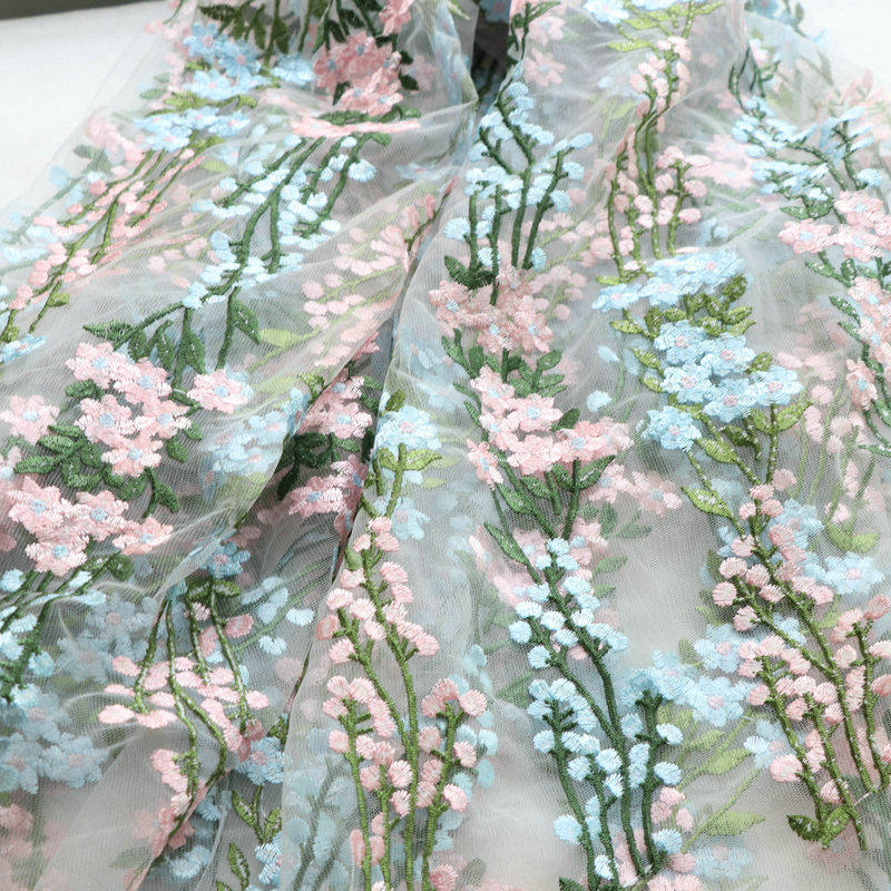 超仙蓝粉彩色刺绣条纹花簇蕾丝网布料田园高档连衣裙罩衣汉服面料