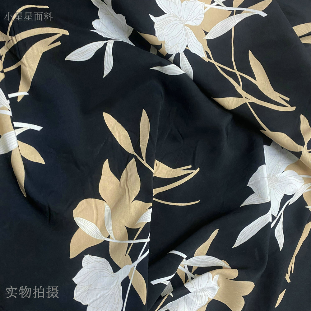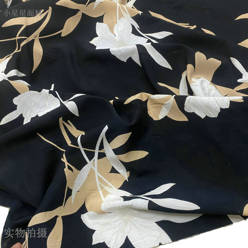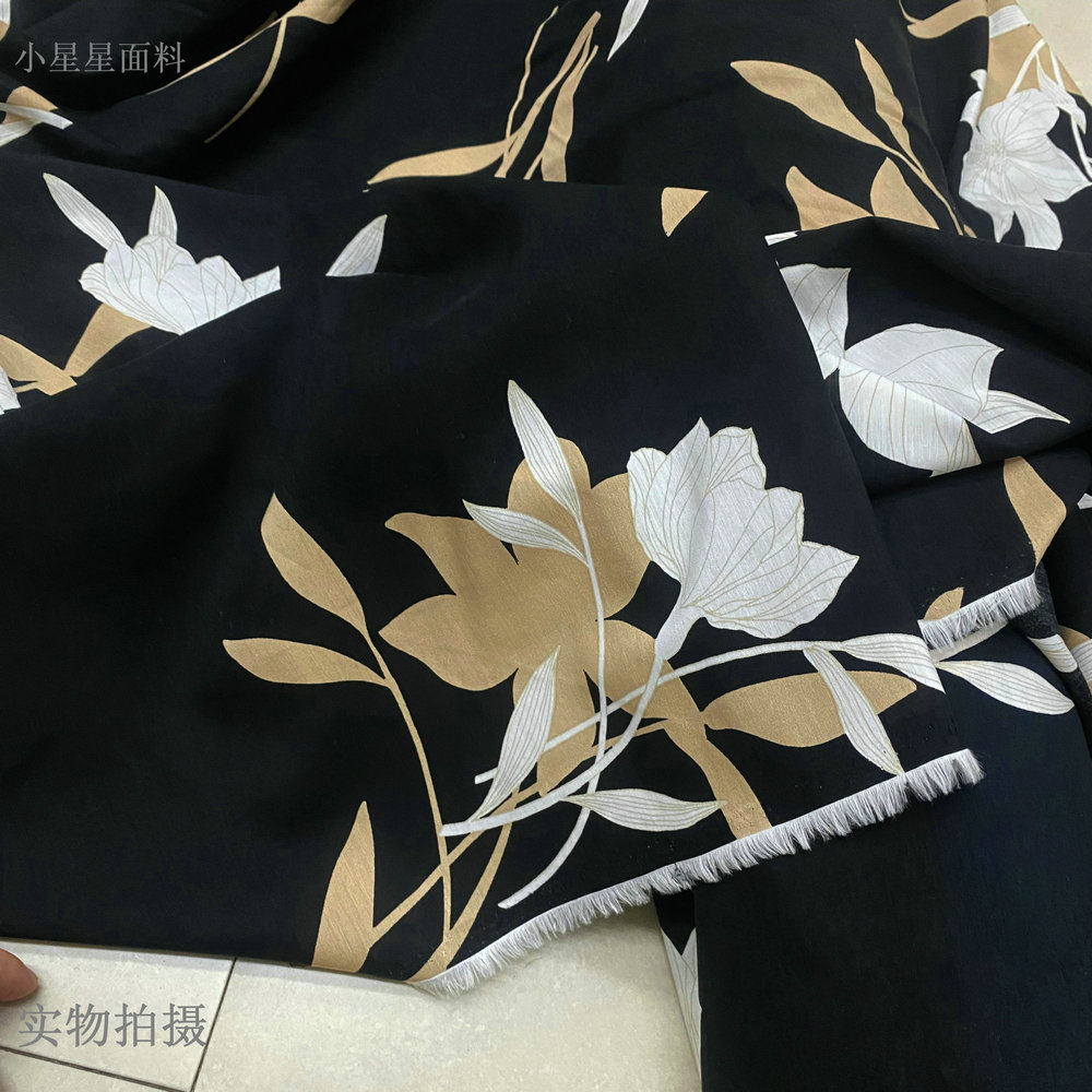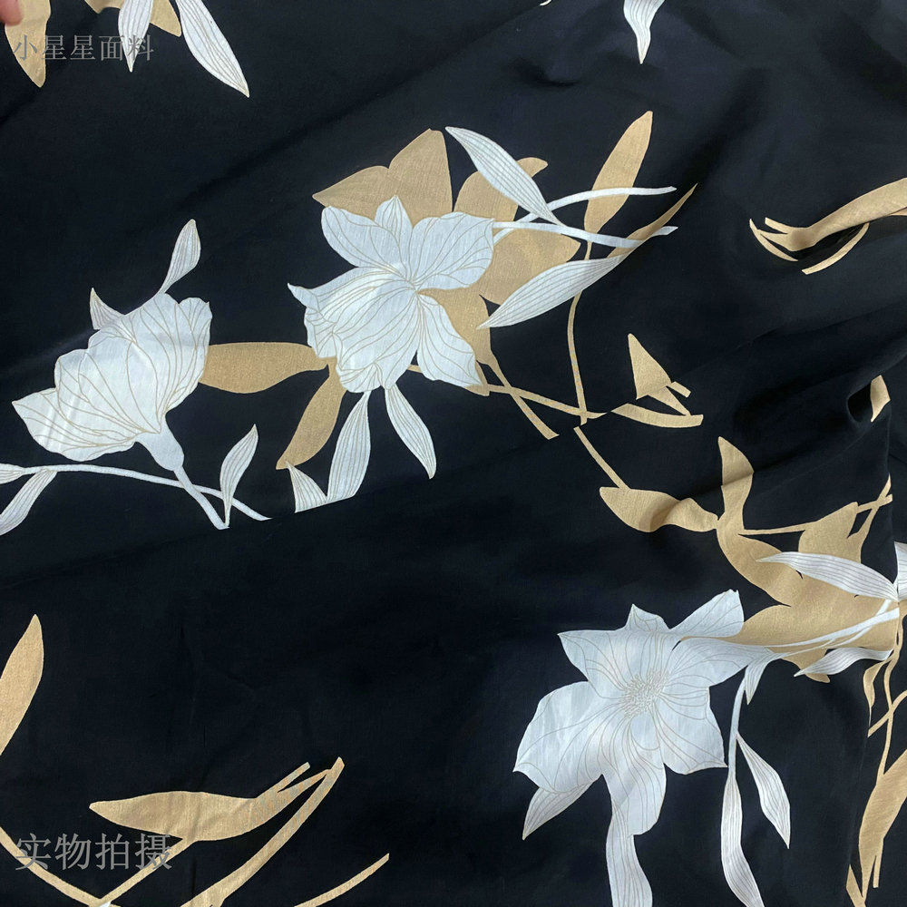黑色纯棉布料夏白玉兰印花卉连衣裙衬衫睡衣服装diy手工设计面料