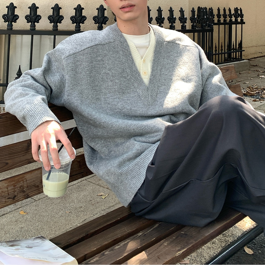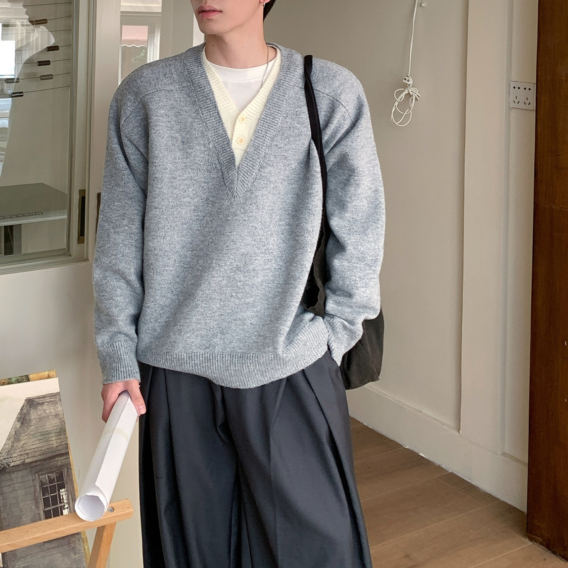 韩式穿搭慵懒风纯色百搭毛衣长袖套头假两件拼接V领针织衫男女款