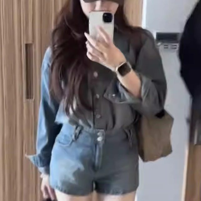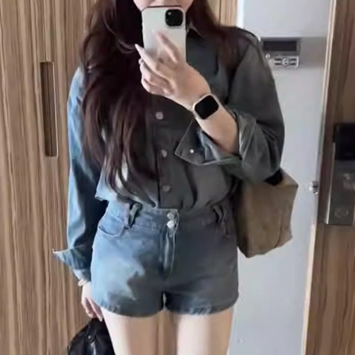 韩系复古蓝色牛仔套装女秋季新款减龄气质长袖衬衫百搭短裤两件套