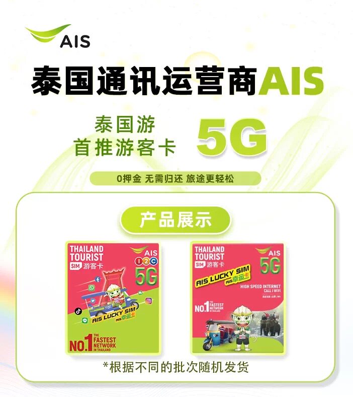 泰国电话卡AIS 5G/4G曼谷旅游可选无限流量7/10天手机高速上网卡