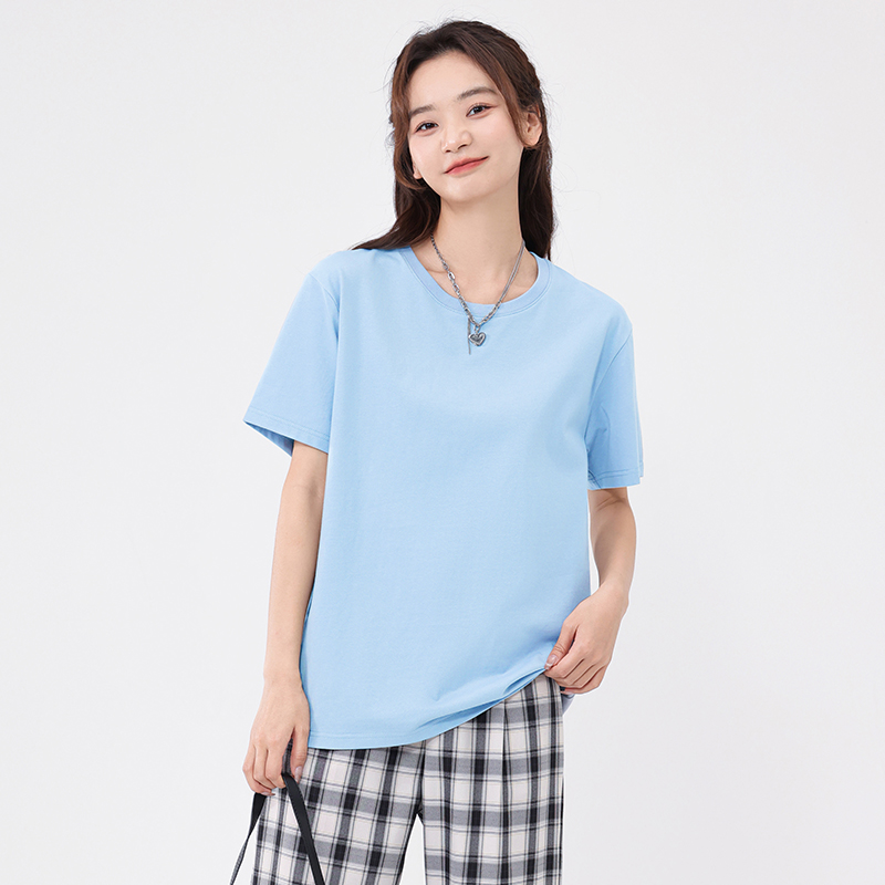 KMV真维斯蓝色纯棉短袖T恤女夏季新款宽松百搭重磅中长美式上衣潮