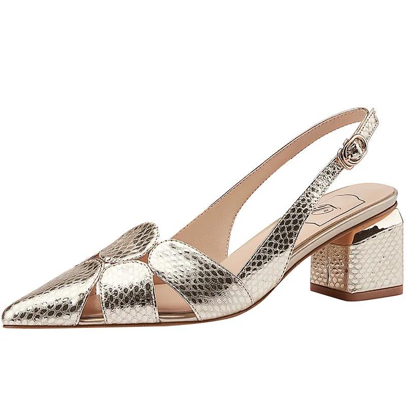 2025年夏季新款金色中跟真皮粗跟凉鞋女百搭时尚尖头后空高跟鞋女