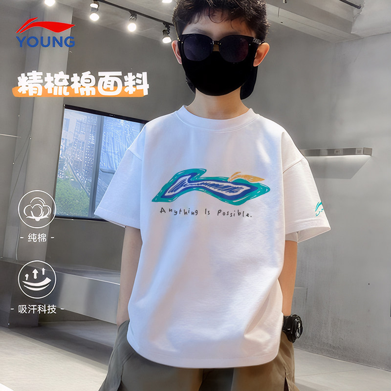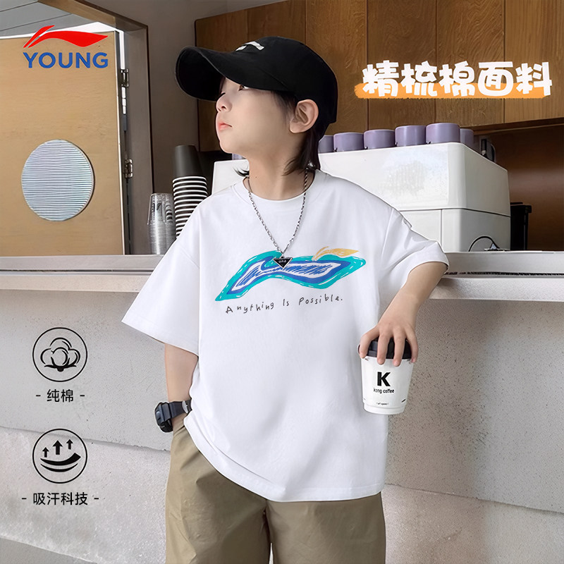 李宁儿童短袖男童2026新款男女大童运动上衣纯棉t恤白色夏季半袖