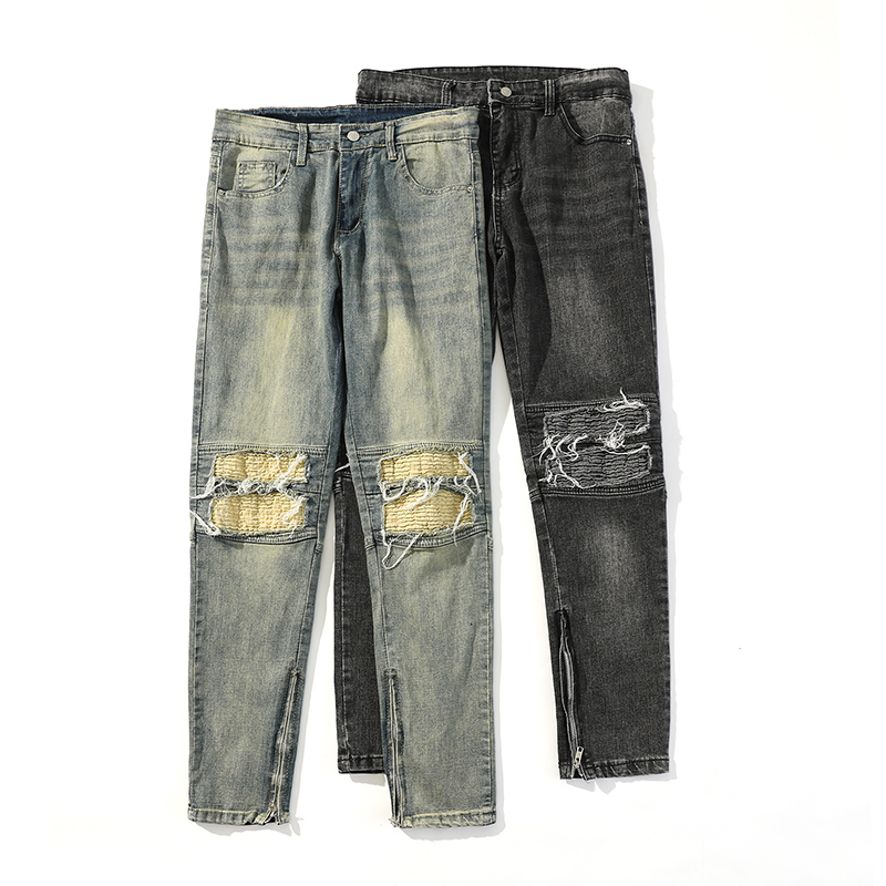 美式水洗破洞牛仔裤男士垂感宽松直筒街头潮流韩版拉链阔腿乞丐裤